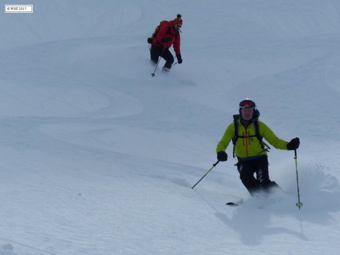 Schnee gut und ausreichend. Abfahrt zum Jörisee mit Top-Pulver.
