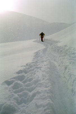 Bis ca. 1400 m nur Schäumchen ohne Unterlage, beim Hinunterfahren Ski selbst auf Strässchen getragen, weil viele kleine böse Steine... Ab 1400 obsi auch im Wald zunehmend Unterlage, bis auf Grimmifurggi schliesslich traumhaft mit ca 30-40 cm leichtestem Pulver. Auf Grat bis Gipfel unterschiedlich: Unterlage teils sehr hart/eisig, selten brüchig. Neuschnee darauf meist gut fahrbar, zwischen 5 und 20 cm, wenig windgepresst. Da meist etwas eingenebelt, nicht viel von weiterer Umgebung gesehen.
