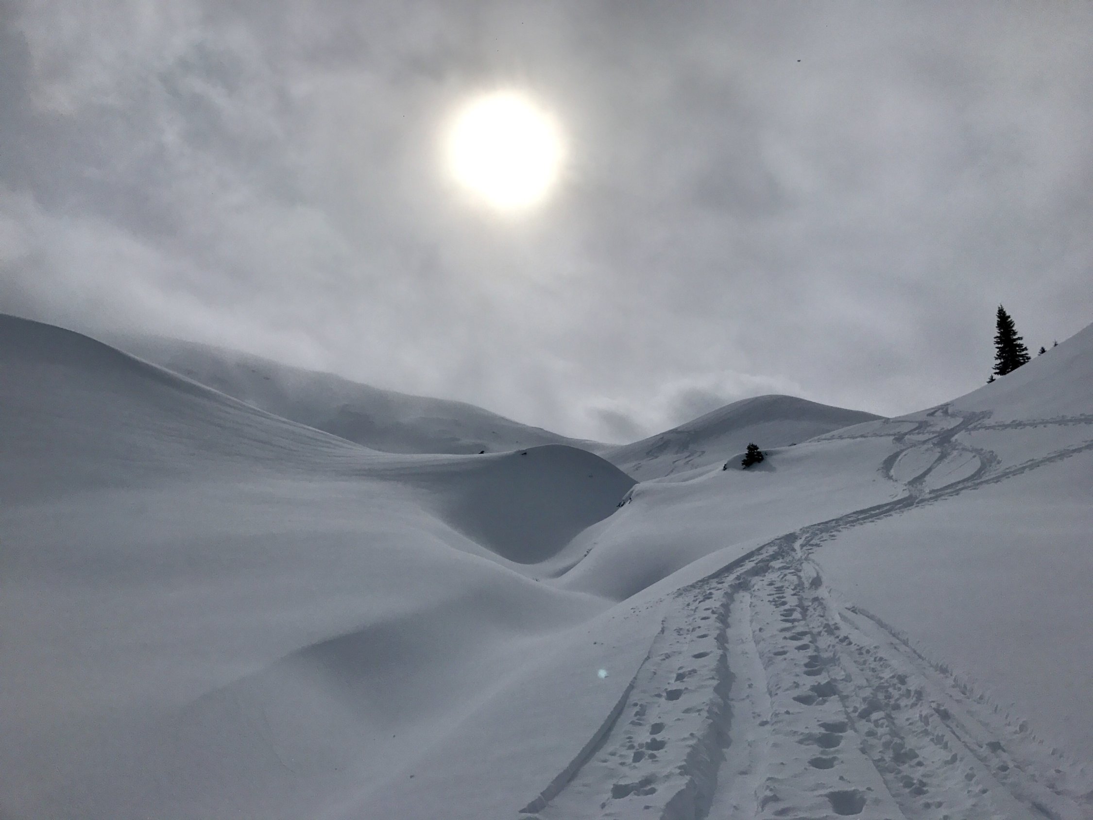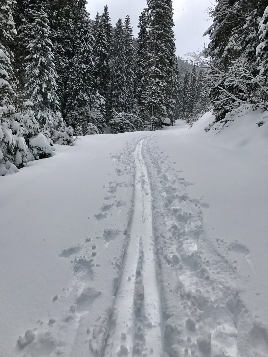 Erster Hang vor Waldweg mässig eingeschneit. Waldweg dann schon sehr gut eingeschneit mit schwerem Pulver. Ab Alphütte dann super Verhältnisse bis etwas oberhalb von Grimmifurggi. Dort dann aufgrund des starken bzw. Stürmischen Wind abgebrochen. Unterhalb Furggi praktisch kein Wind. Gipfelflanke entsprechend hart und verblasen. Wind aus Südwest. Nordexponierte Hänge stark eingblasen. Abfahrt top auf der gleichen Route. Generell Wetter besser als erwartet. Sogar die Sonne hat sich kurz gezeigt.