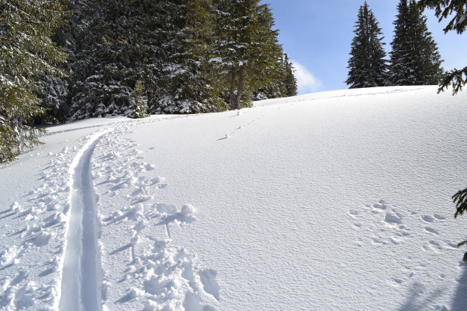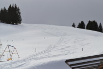 Schnee auf der ganzen Abfahrt mehr oder mehr "schaffig". Oben noch etwas weniger feucht (dafür etwas windgeprägt), unterhalb 1600 nasser bis sehr nasser Nassschnee, aber gut fahrbar. Wir sind dann zuunterst dem Weg gefolgt - dort hat es sicher keine Steine...