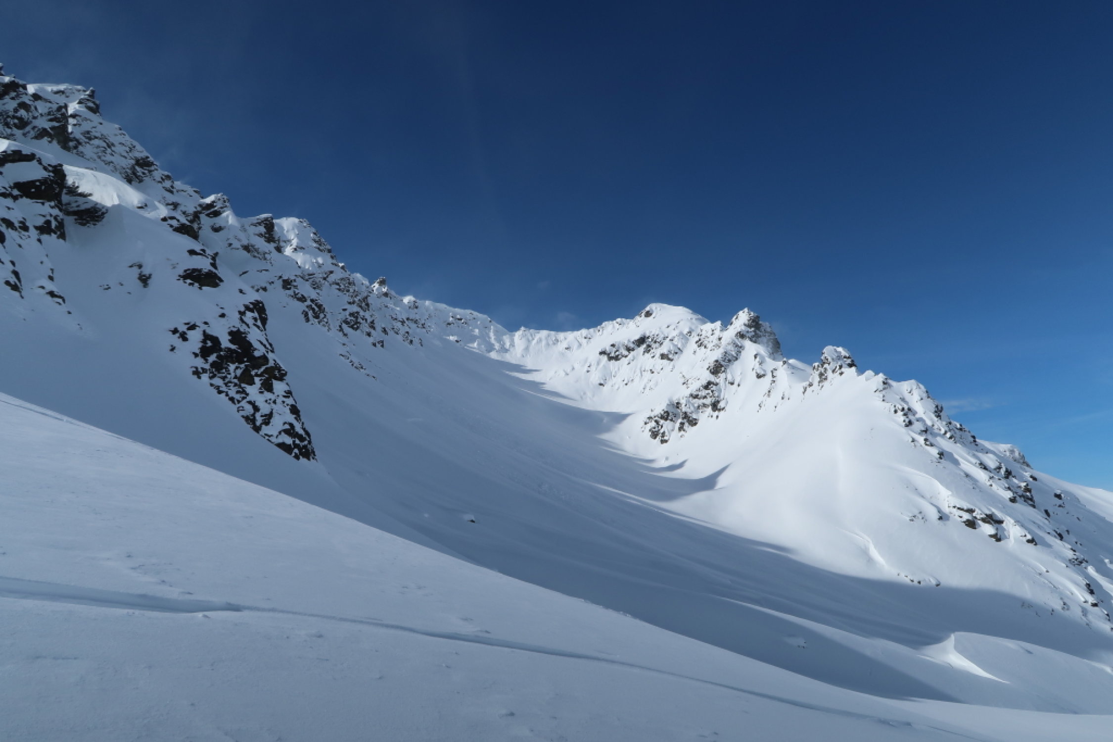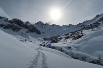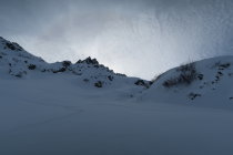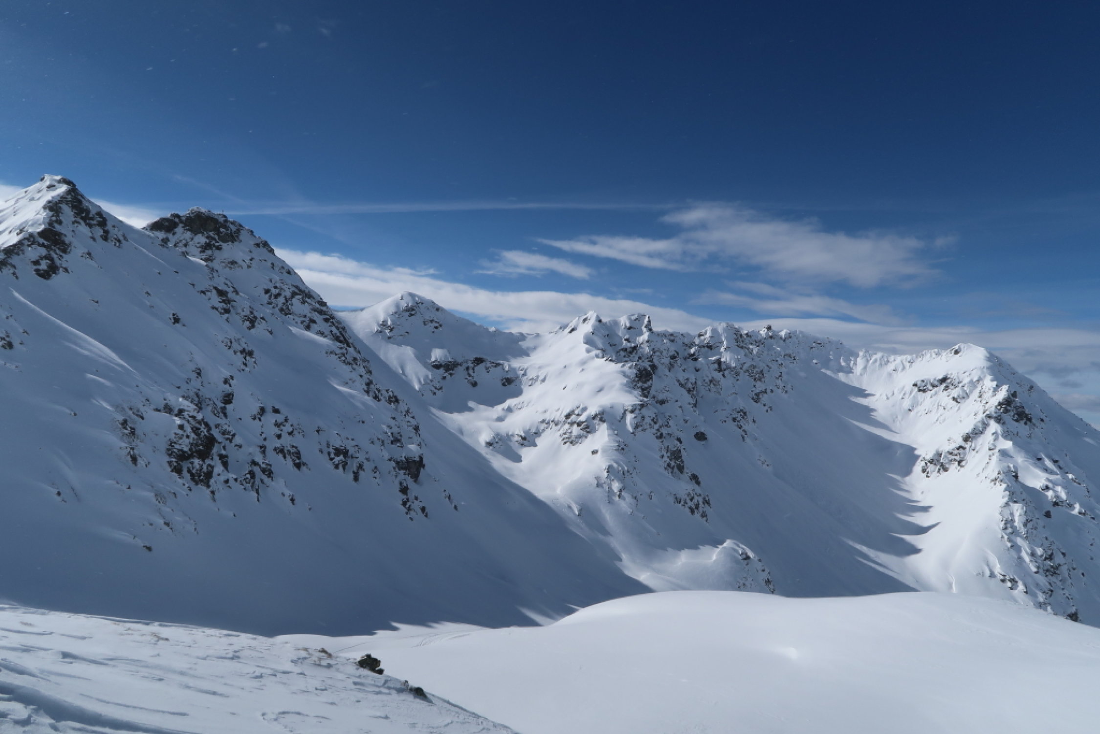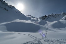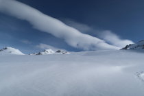 Auf dem ganzen Weg genügend Schnee vorhanden. Auf der Abfahrt vom Gipfel bis ca. 1800m schöner Pulverschnee.