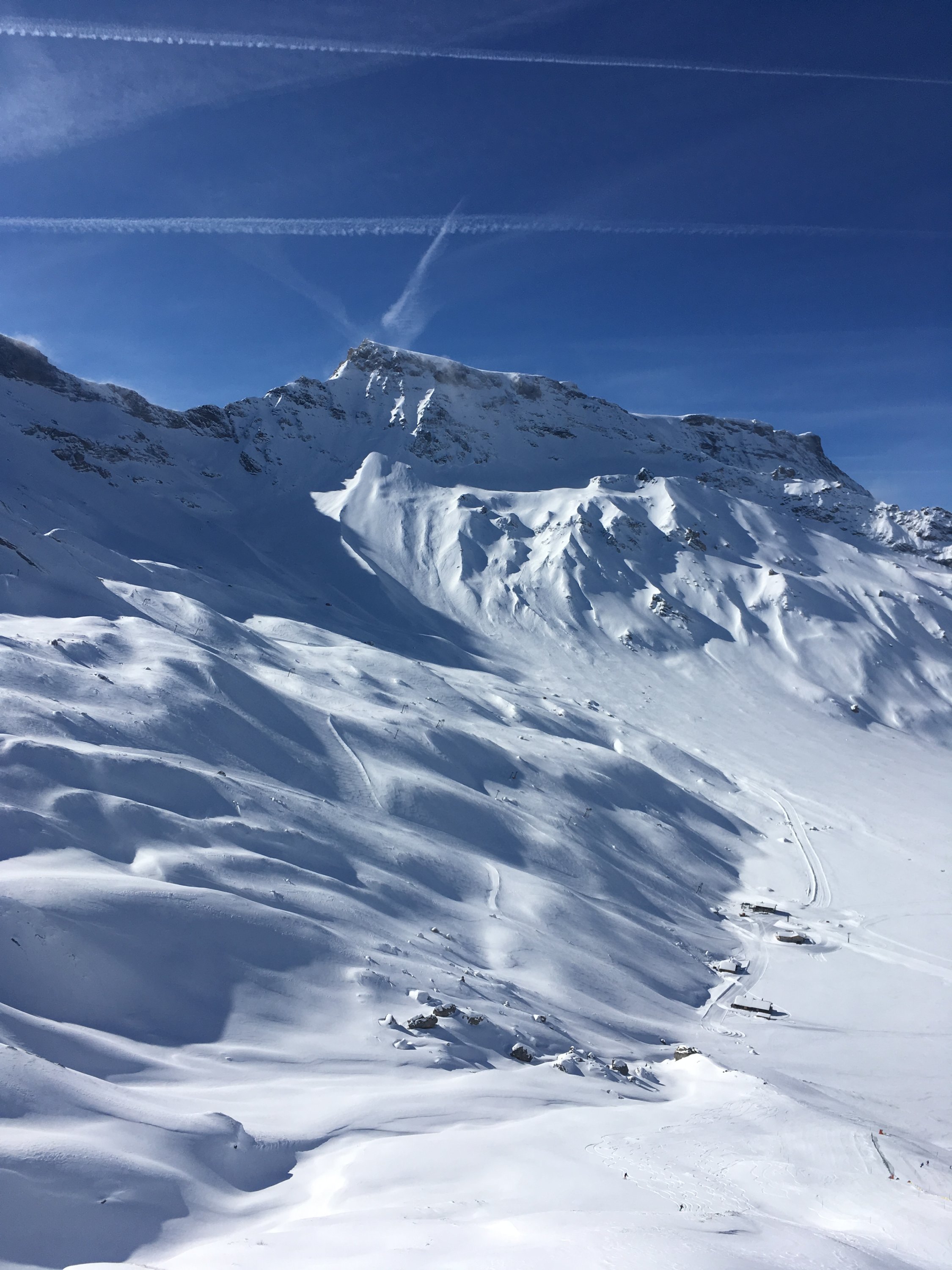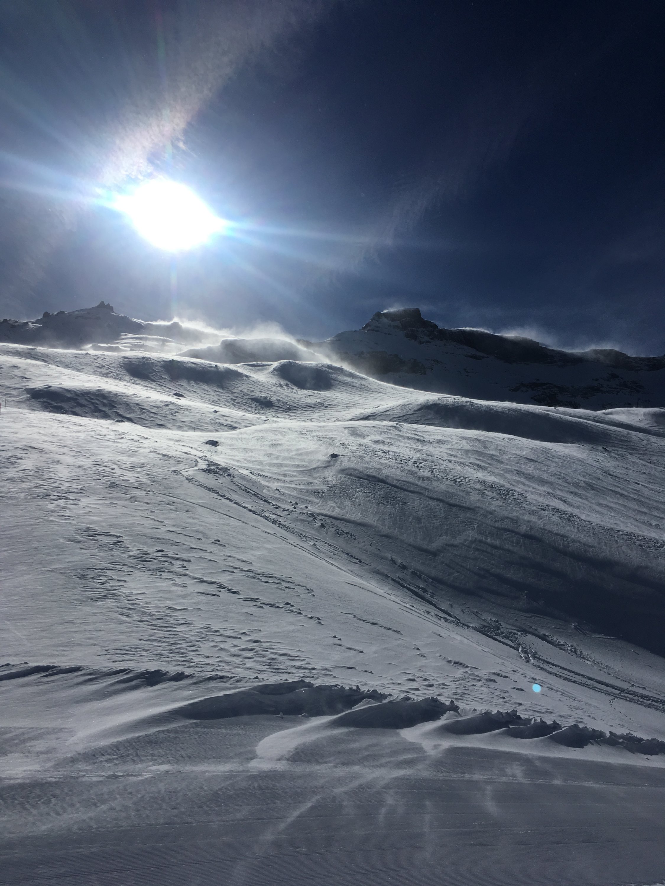 Wetter blauer Himmel aber morgens schon grosse Windfahne am Grosstrubel. Oben dann windig aber trotzdem angenehm warm. Eigentlich wollte ich erst ein paar Lifte Freeriden, leider öffnet der hintere Lift nicht wegen dem Wind. Schliesslich ein paar mal den kurzen Lift gefahren und dann mit Splitboard richtung Tschingel. Grate alle abgeblasen mulden gefüllt aber gutmütig. Schnee pulvrig-mehlig. Es musste eher feucht geschneit haben.