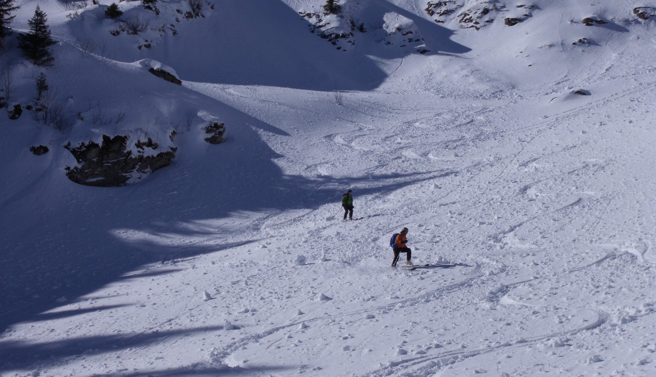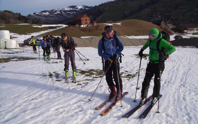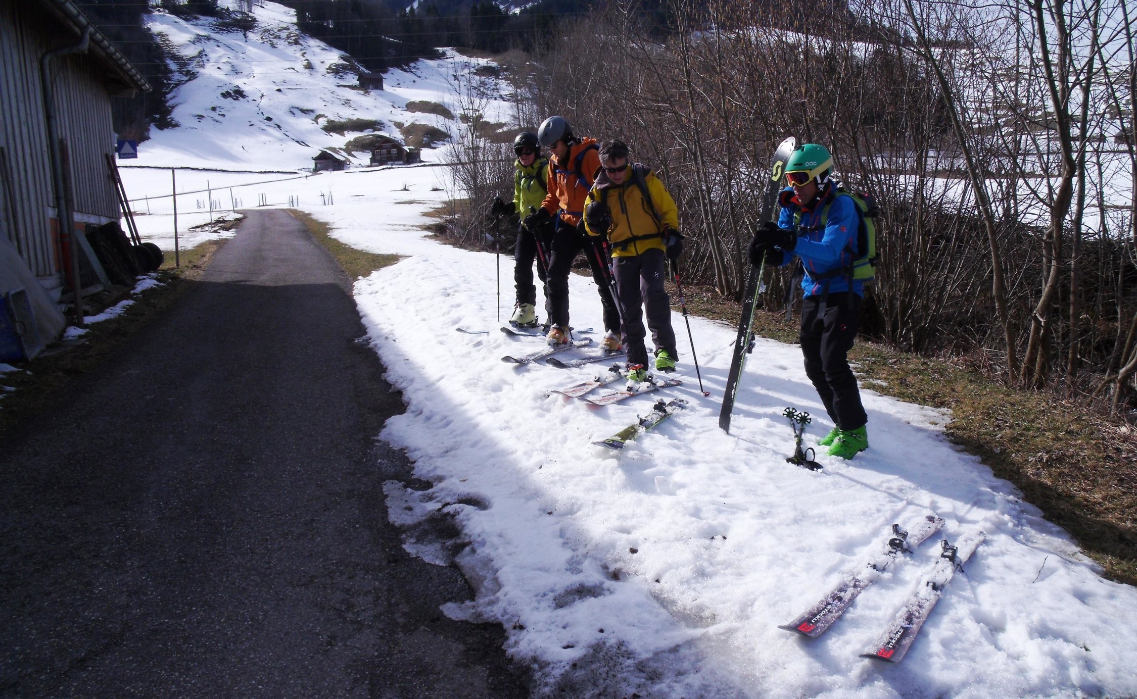 Unsere Autos haben wir beim Parkplatz des ehemaligen Skilifts bei Stein abgestellt. Die Schneedecke war etwas knapp aber gut durchgefroren, sodass der Aufstieg problemlos ging. Mit zunehmender Höhe immer mehr Schnee. Der erste Hang des Gulmen hat sehr wenig Schnee, geht aber gut im Aufstieg. Die Abfahrt durch das Ostcouloir war wunderschön. Auch die Hänge der Häderen waren aufgesulzt und wunderschön zu fahren. Wir konnten ohne Mühe bis zum Talboden nach Stein hinunter fahren.
