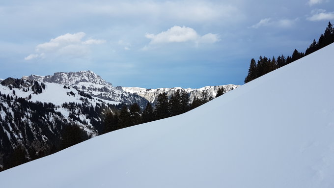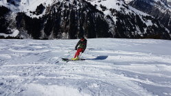 Schnee hat gerade noch ausgereicht. Ist gibt apere Stellen auf dem Waldweg oberhalb Hindere Filderich. Bei der Abfahrt zum Mittelberg wedelt man zwar begeistert auf einer tollen Schneedecke...die Spur zeichnet sich aber in grünem Kontrast.