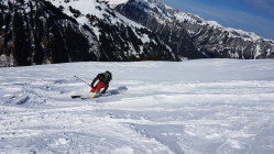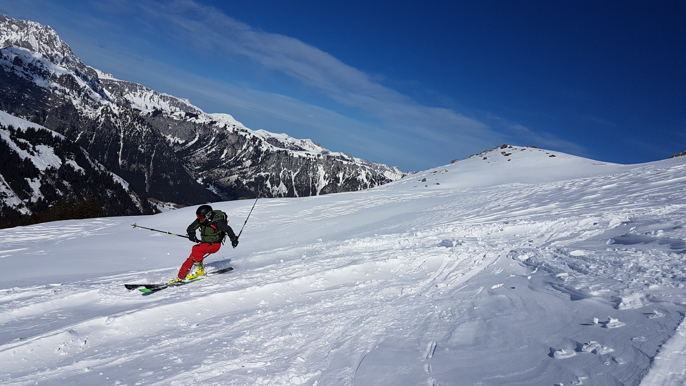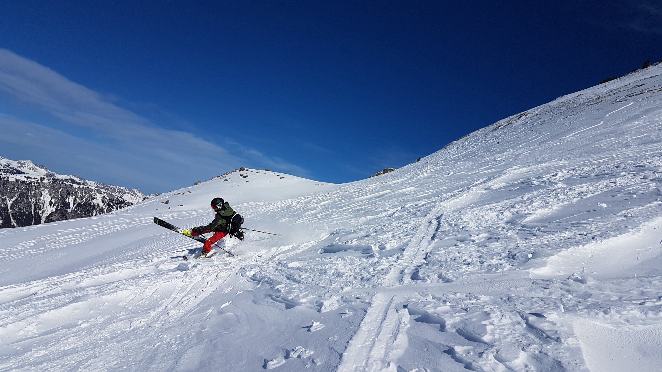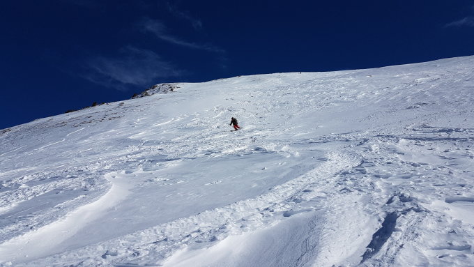 Der Grat ist stark abgeblasen und hat eisige, pulvrige, harstige und steinige Stellen. Besonders spannend sind die zahlreichen Zastrugis zu fahren.