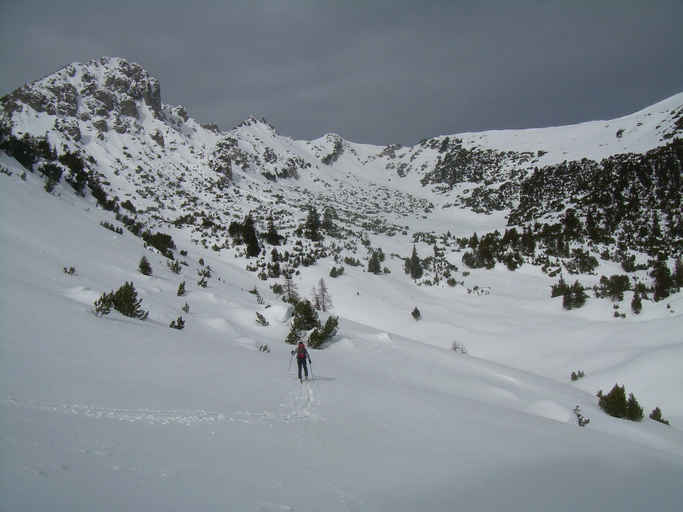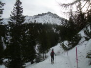 Neben der Lawinenlage erheblich, welcher wir schon bei der Tourenplanung mit der Auswahl eines verantwortbaren Gipfelziels Tribut zollten, war heute der Föhnsturm das große Thema. Dieser war nicht ständig, aber überiegend präsent, und zwar nicht regelmäßig, sondern in Böen daherkommend, die einen auch mal von den Beinen nehmen konnten, wenn man einen Moment nicht aufpasste. Dennoch war die Tour bis zum Gipfel durchführbar, mit tollen Aussichten. Überhaupt ist das eine zwar recht kurze, aber landschaftlich überaus reizvolle Tour, auf der wir heute die Einzigen waren.