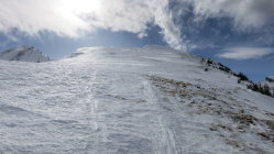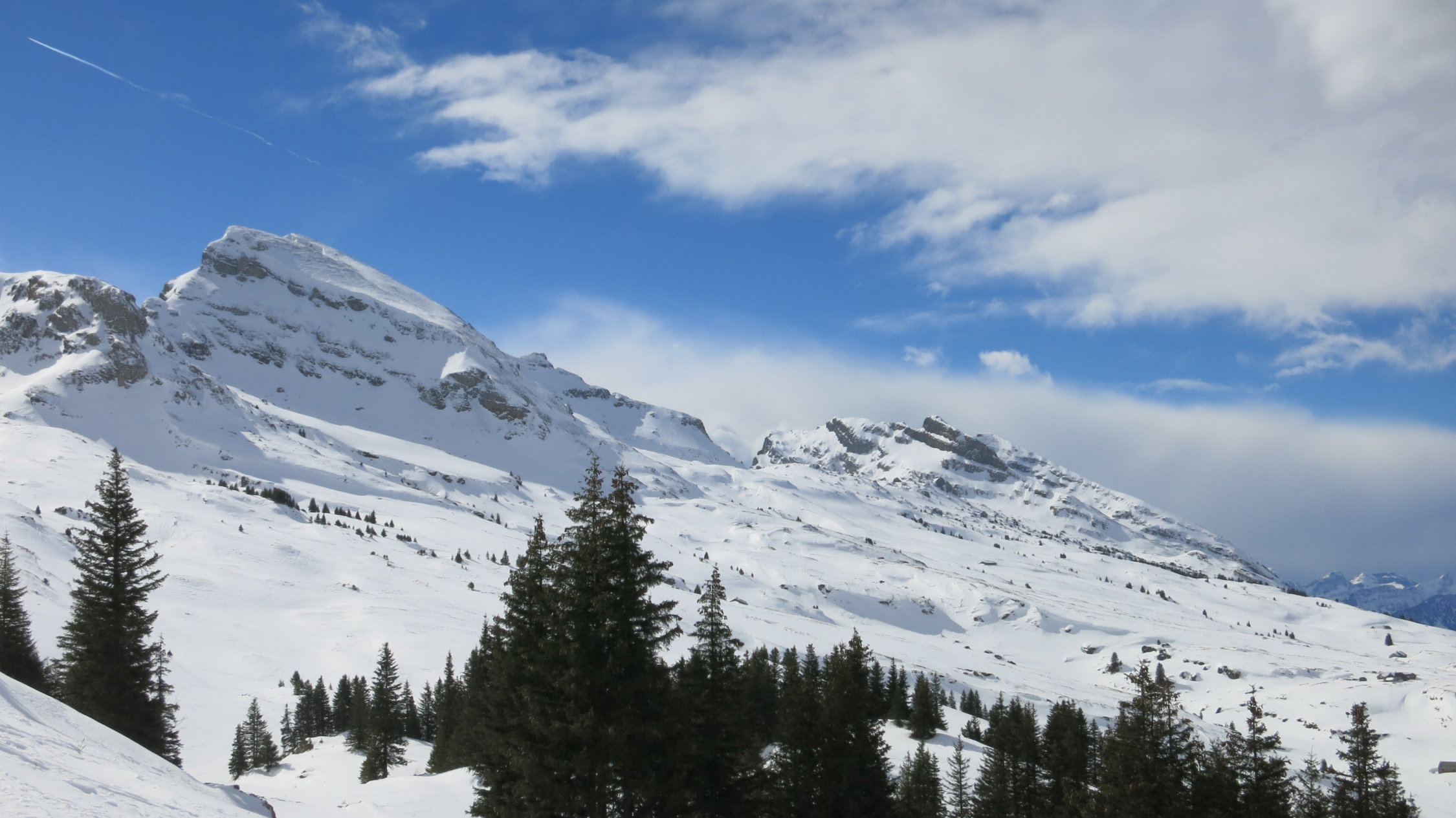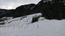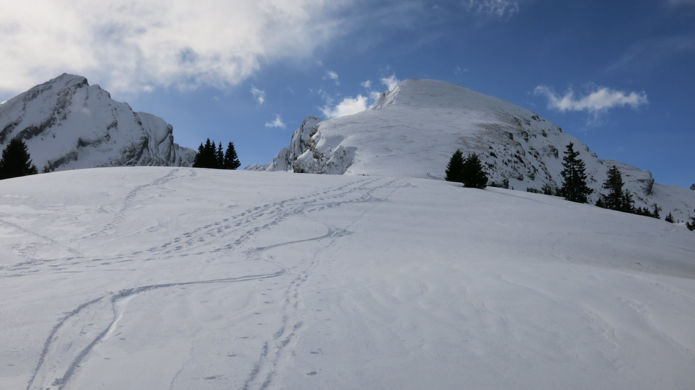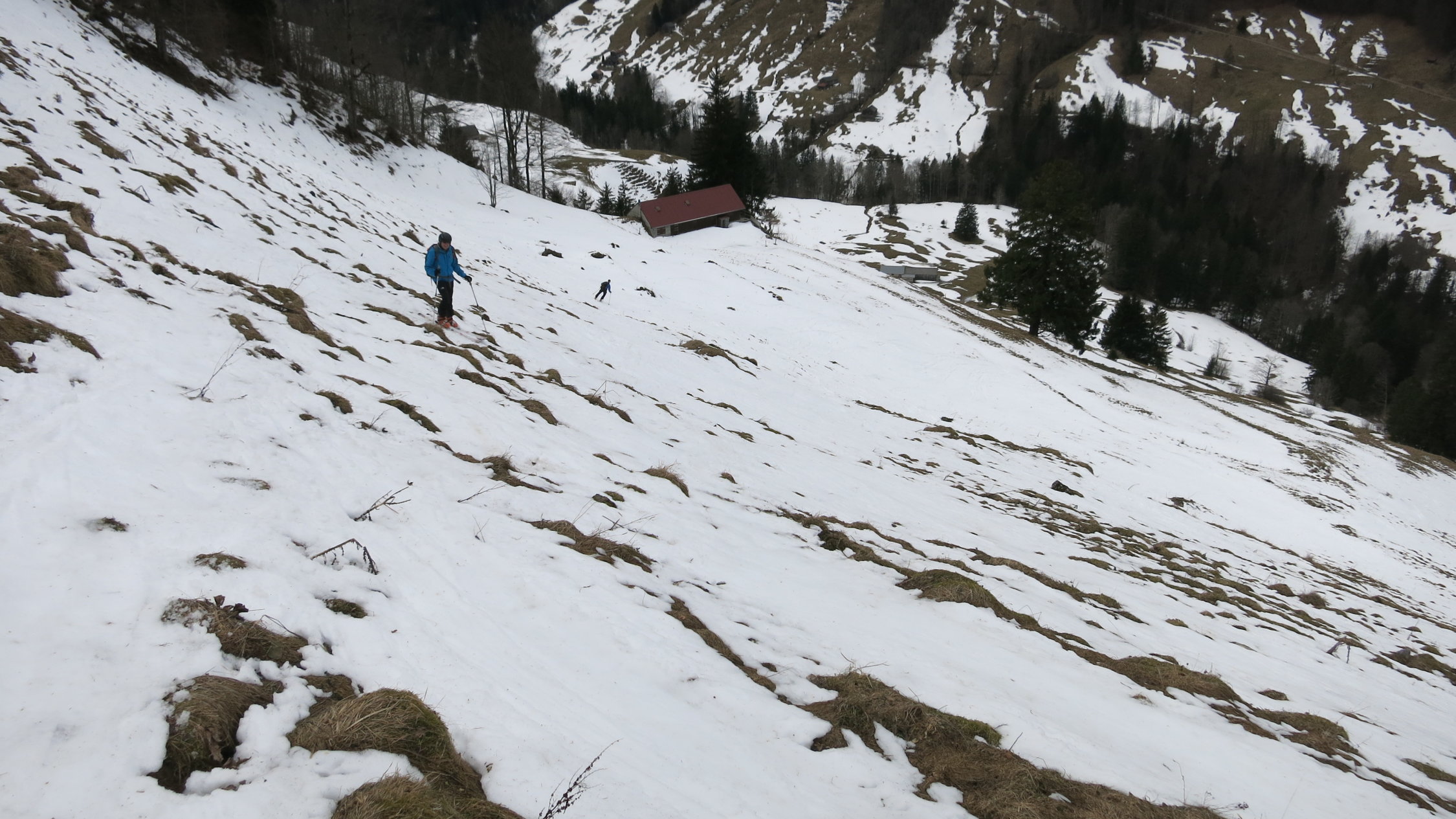 Gestartet um 9h ab PP Selun-Bähnli. Anfänglich muss man den Weg etwas suchen zw. den grünen Flecken. Beim Waldeingang eine Tragstelle von ca. 50m. Anschliessender Aufstieg durch den Wald ist passabel - Strichboden bis Selun-Gipfel problemlos; Harscheisen erleichtern den Aufstieg, da Hang weitgehend verblasen. Angekündigter Wind hält sich in Grenzen. Aussicht vom Gipfel wunderbar. Gegenüber im GL tobt der Föhn-Sturm...