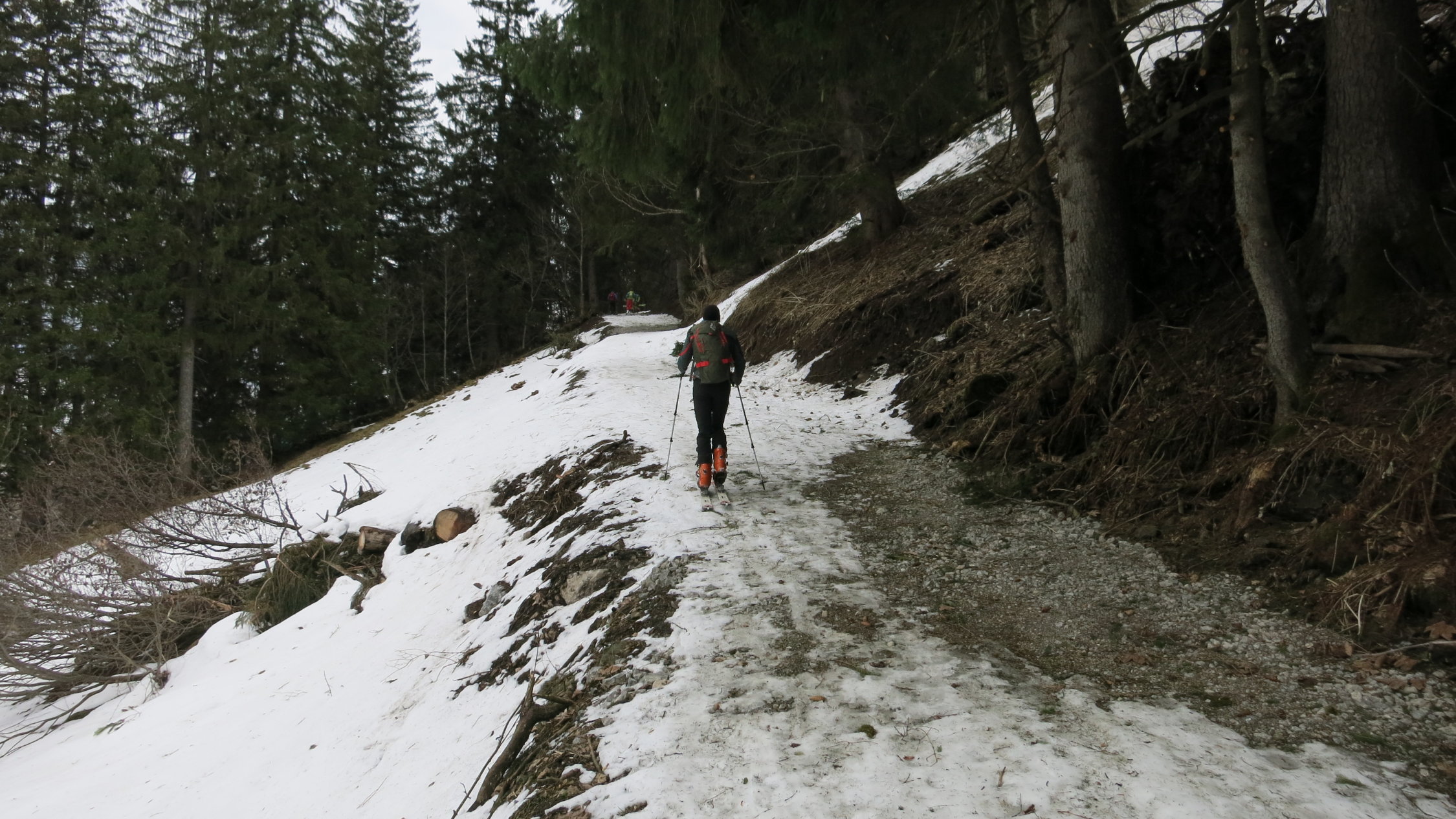 Abfahrt Gipfelhang hart und stellenweise ruppig; unten feucht und klebrig. Waldabfahrt problemlos, abgesehen von der 50m Tragstelle. Waldausfahrt bis PP mussten wir wiederum den optimalen Weg suchen, jedoch fahrbar.