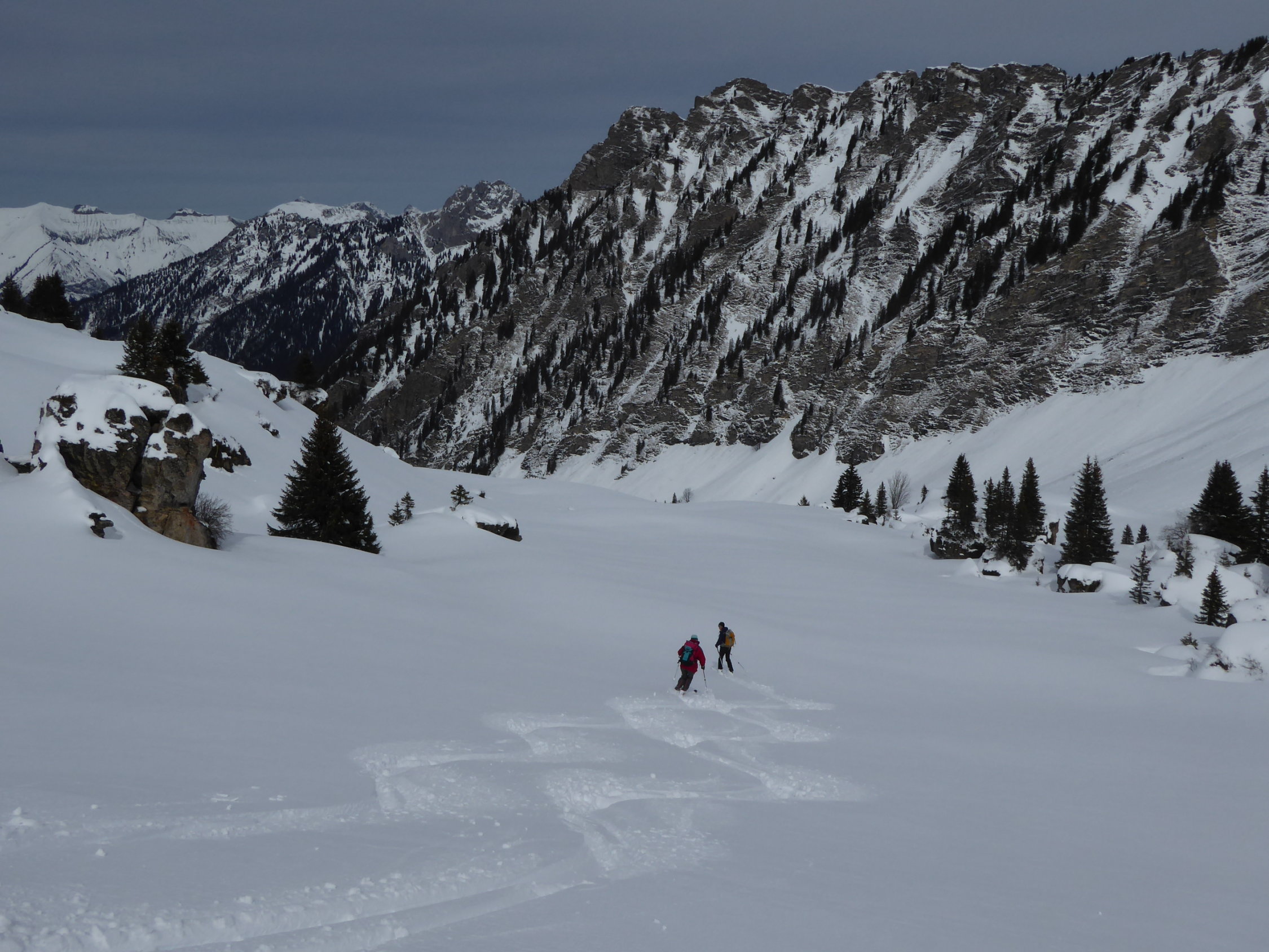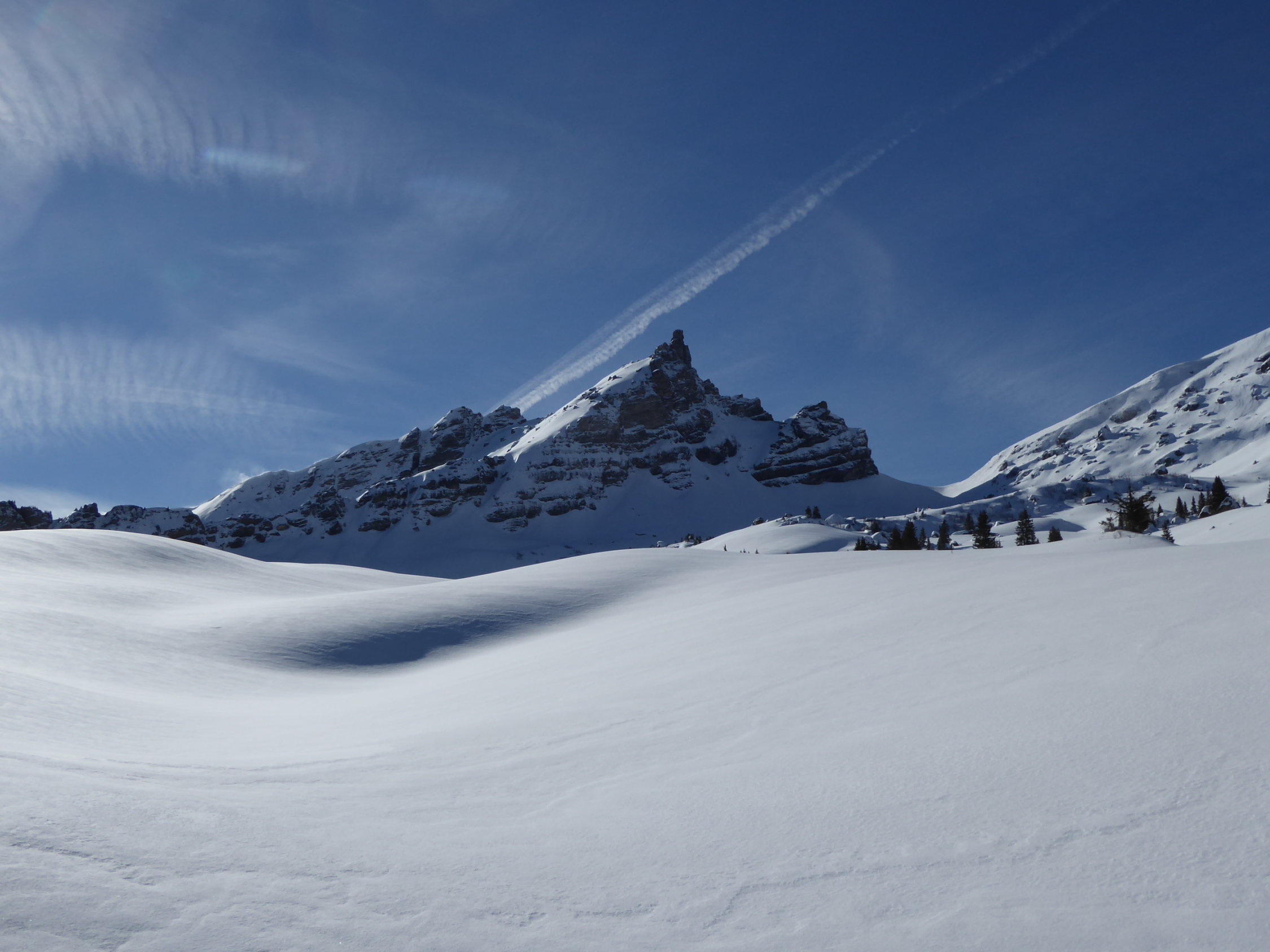 Im allgemeinen gute Verhältnisse auf der ganzen Tour. Start von Etivaz, Strasse entlang Bach bis Staubecken Hartschnee, Hang von Les Maulatreys knapp genügend Schnee. Von da bis Col de Seron 2153m Pulverschnee, weiter auf Südseite des E-Grates windverfrachteter Pulver. Am Gipfelgrat vorsichtige Routenwahl erforderlich (Wächte nordseitig, wenig gefestigte Schneedecke südseitig). Vom Gipfel bis Alp Maulatrey sehr gut Schneebedingunegn für Abfahrt.