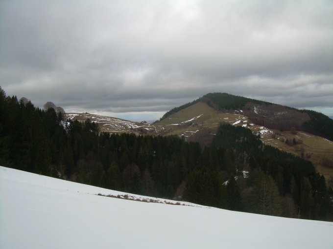 Da ich mit ÖV angereist war, nahm ich folgenden Alternativabstieg vor: nahe dem Belchenhaus über den südlich hinuntergehenden Pfad (blaue Raute) bis Böllener Eck. Dort Querung mit leichtem Wiederanstieg über Forstweg zum gleichnameigen Punkt im Wald. Jetzt die Obere Stuhlsebene gequert und über den Stuhlsebeneweg weiter abgestiegen. Anschließend auf der gelben Raute via Schönenberg hinab nach Schönau.