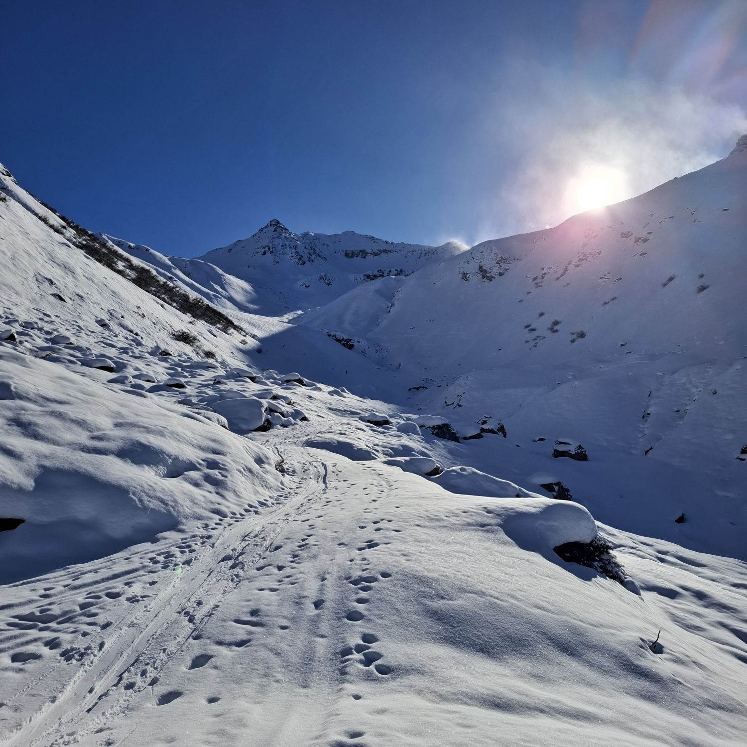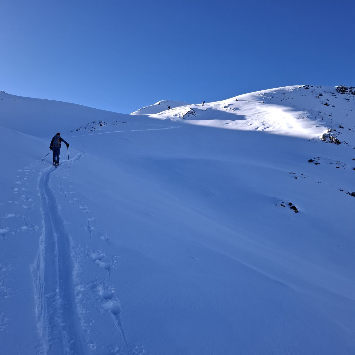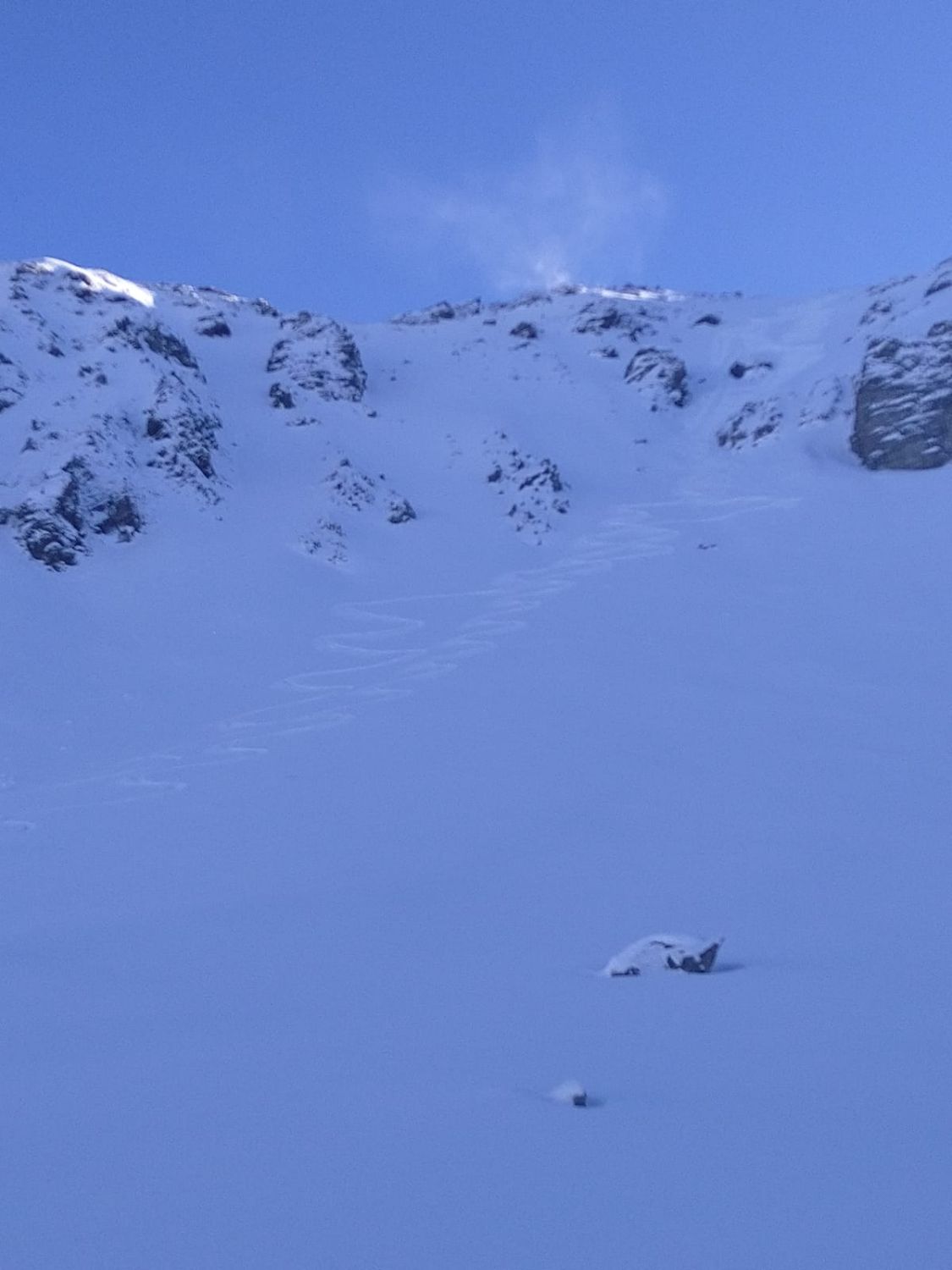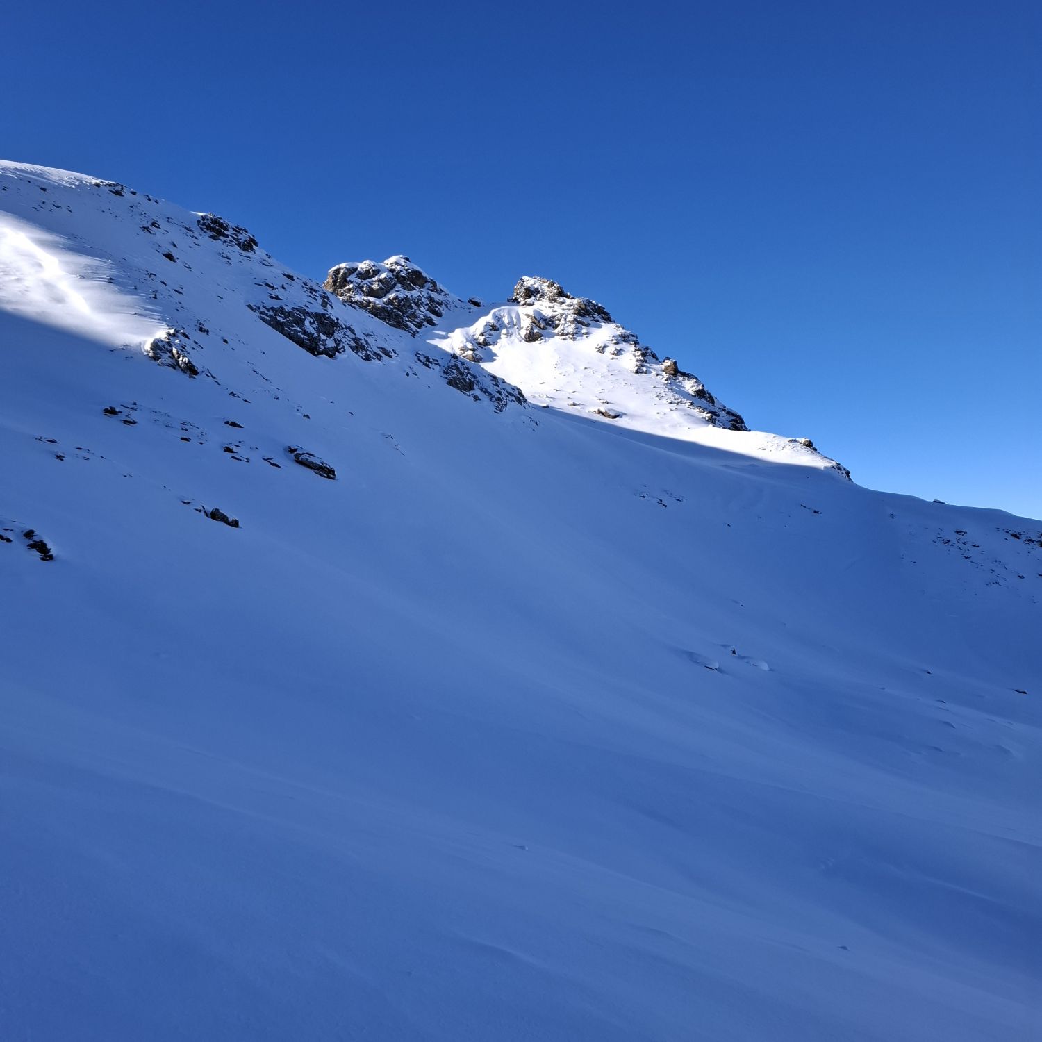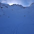 Die alten Spuren kann man noch gut erkennen somit ging es leicht die dezent überschneiten Steine zu umfahren. Achtsam sein wegen der alten Spuren die ganz hart sind und eben nicht ganz eingeschneit. Keine Windverfrachtung des Neuschnees. Wundervoll drehender Pulver. Wir hatten sehr viel Spass.