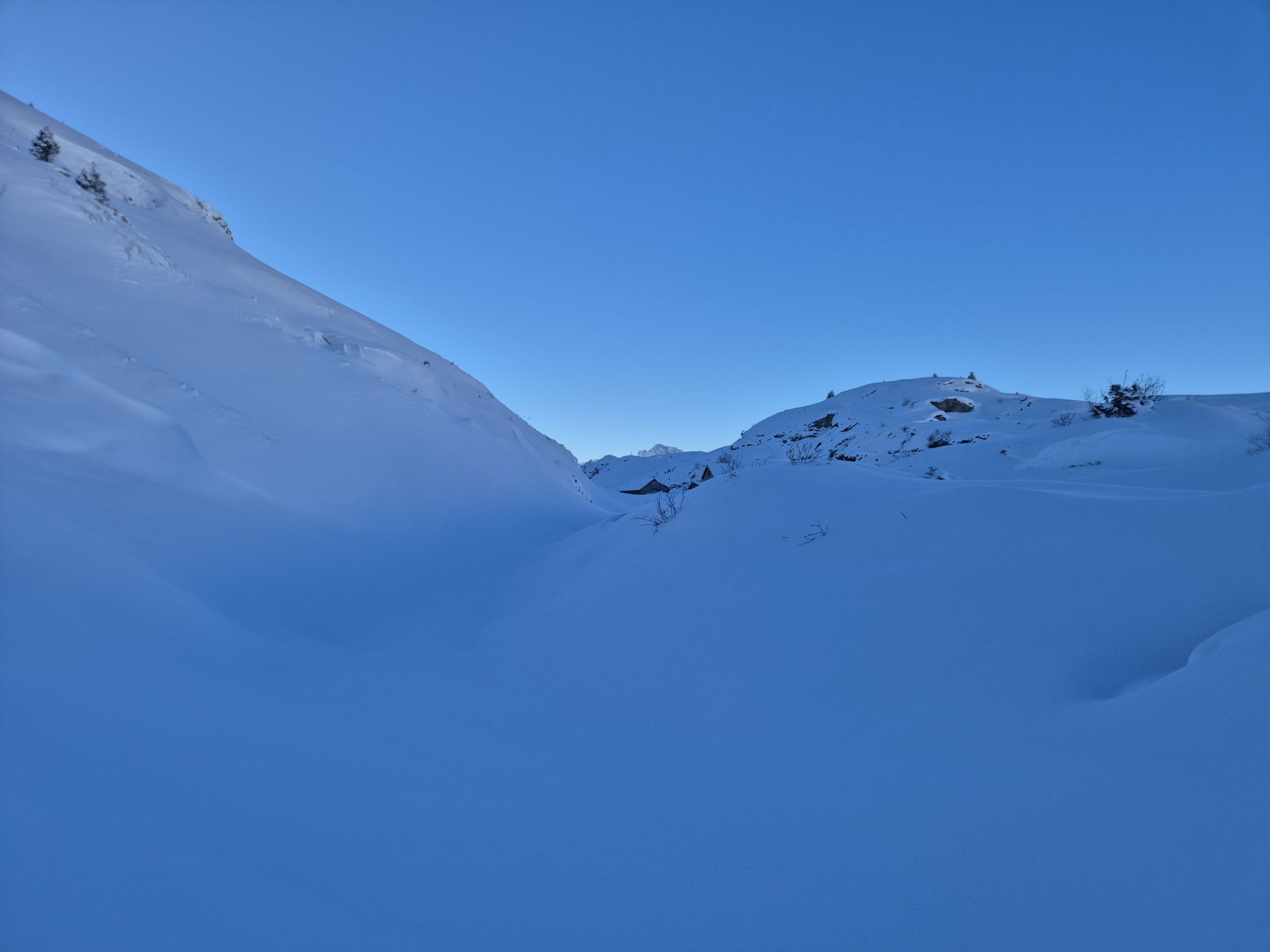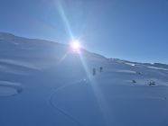 Ausgezeichnet für die fast 40cm super Pulver. Unterlage fehlt oft und Löcher sind viele nicht zu. Genuss mit angezogener Handbremse, der Ski machte 3-4 Mal harte Bekanntschaft mit Stein. Ansonsten top und für die Tour wenig Leute.
