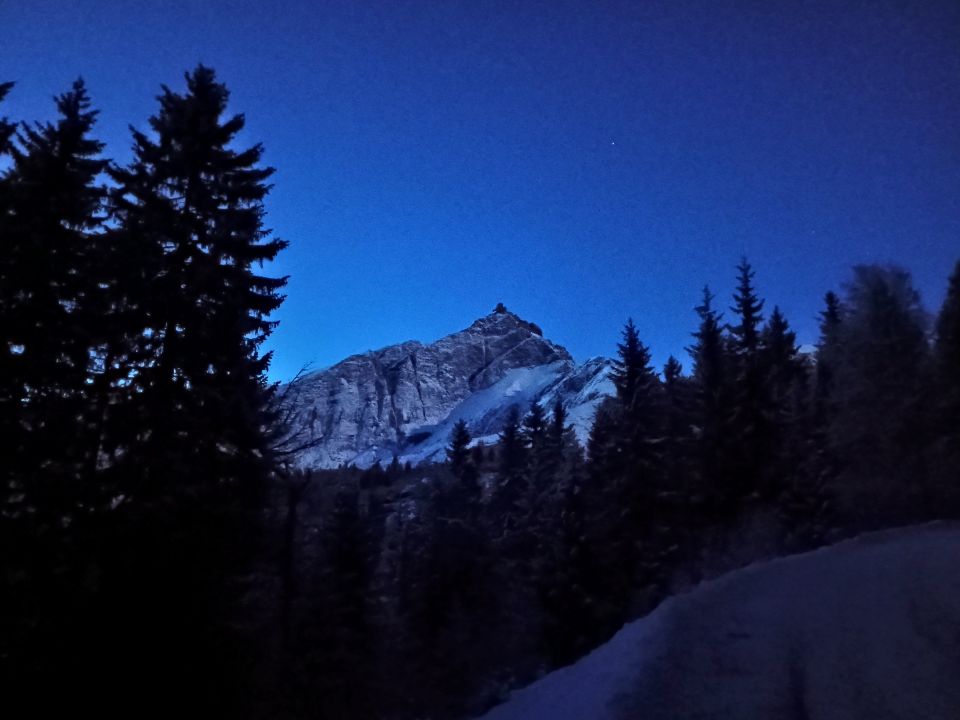 Bin mit dem ersten Poschti bis Obertschappina. Dann auf der gepfadeten Strasse auf den Glaspass. Bis hierher wäre auch mit PW möglich. Vom Glaspass bis auf den Heidbüel (od. Hochbüel, P.2100) war eine gestampfte Spur vorhanden. Ging gut zu Fuss. Ab dem Heidbüel stieg ich mit den Schneeschuhen bis in den ersten steilen Hang und wechselte auf die Steigeisen. Manchmal war die Schneeauflage dünn und das Vorwärtskommen ring, manchmal aber Einsinken bis zum Becken. Und bitterkalt. Besonders die vielen zu querenden Rinnen nach der Gemschlügga P.2558 verlangten viel und anstrengende Spurarbeit. Die ersten Sonnenstrahlen gab's erst in der Scharte P.2826. Nach der Scharte den ersten Felsaufschwung noch mit den Steigeisen. Dann bis auf den Gipfel mit Schneeschuhen. Zwischen Scharte und Gipfel lag wenig Schnee (windexponiert), aber er war recht heterogen.