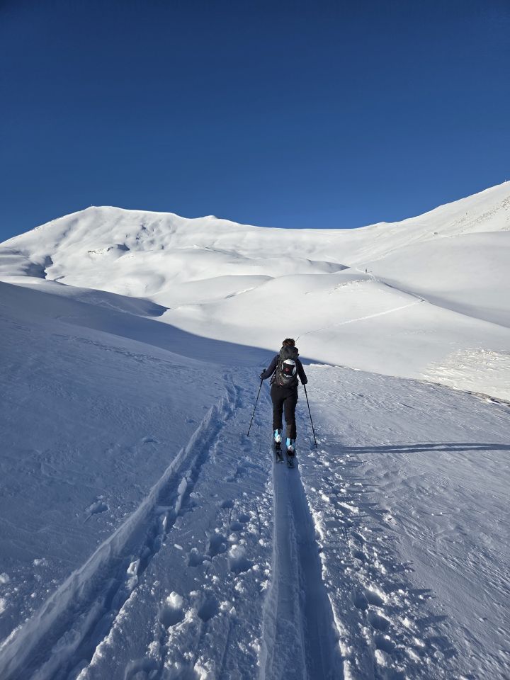Abfahrt: Ganz oben im Gipfelhang eher abgeblasen und hart. Dann kann man an vielen Stellen auf perfekten Pulver (ca. 7-20cm) seine Schwünge ziehen. Je weiter unten man kommt, desto knapper wird es. Jedoch kein Steinkontakt, aber im unteren Bereich immer wieder Graskontakt.