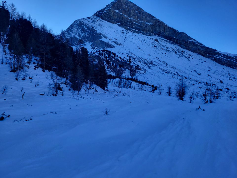 Es hat genügend Schnee für diese Tour. Ganz wenig Neuschnee hat dafür gesorgt, dass die Aufstiegsspur schön griffig ist. Gute Spur durch den Sagiwald und im Gipfelhang. Im Bachgraben und im Gipfelhang habe wir Harscheisen montiert. Auch die Abfahrt war hart, aber griffig.