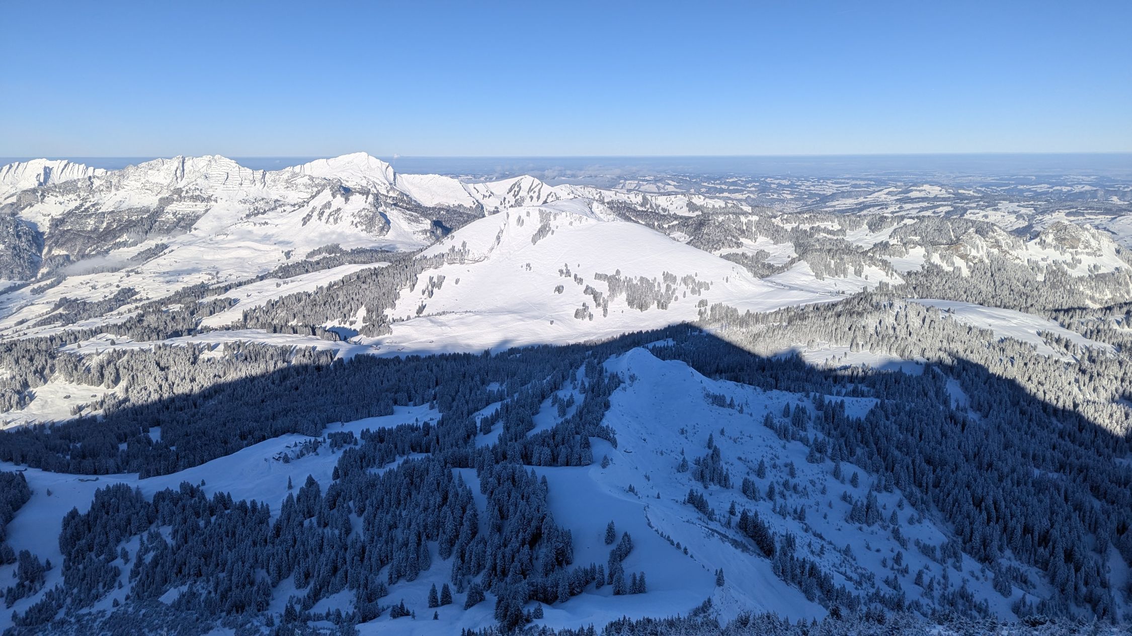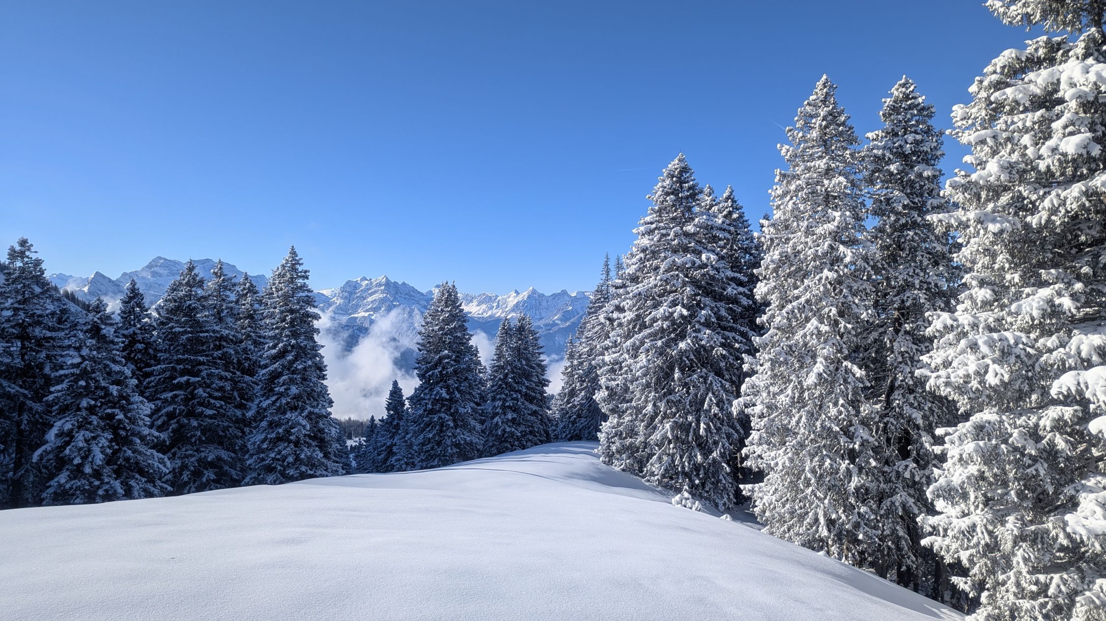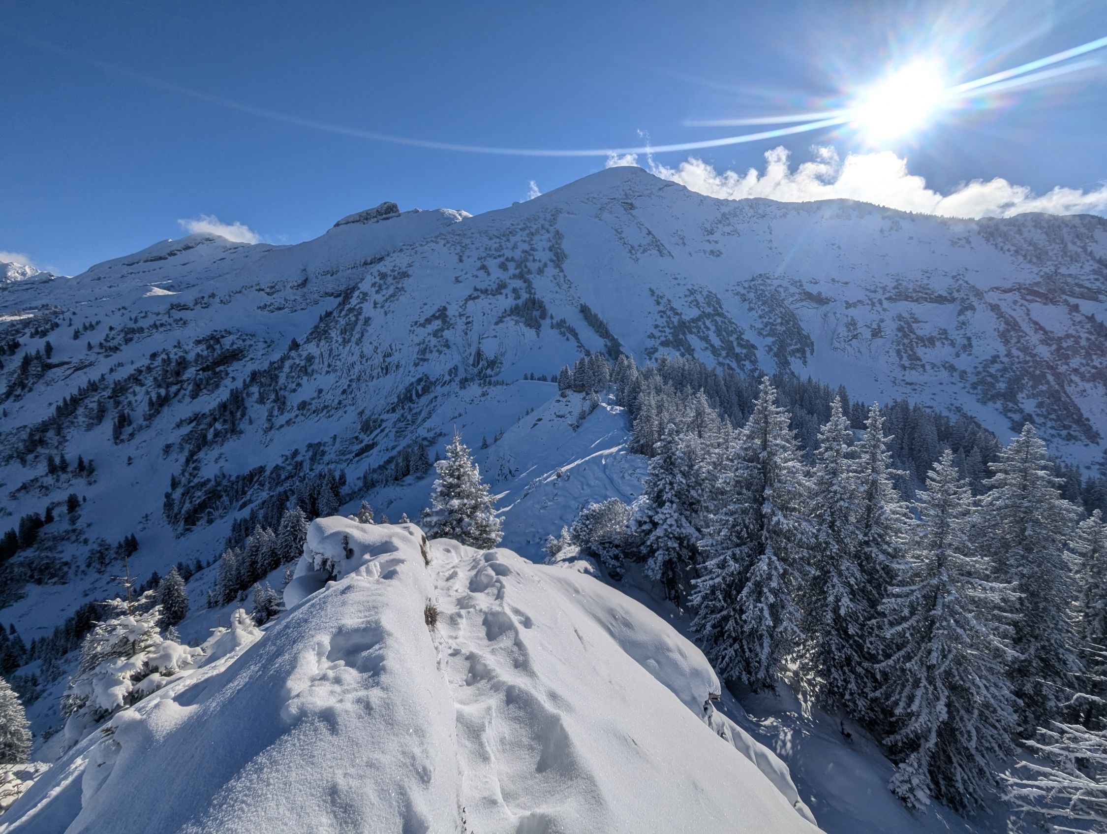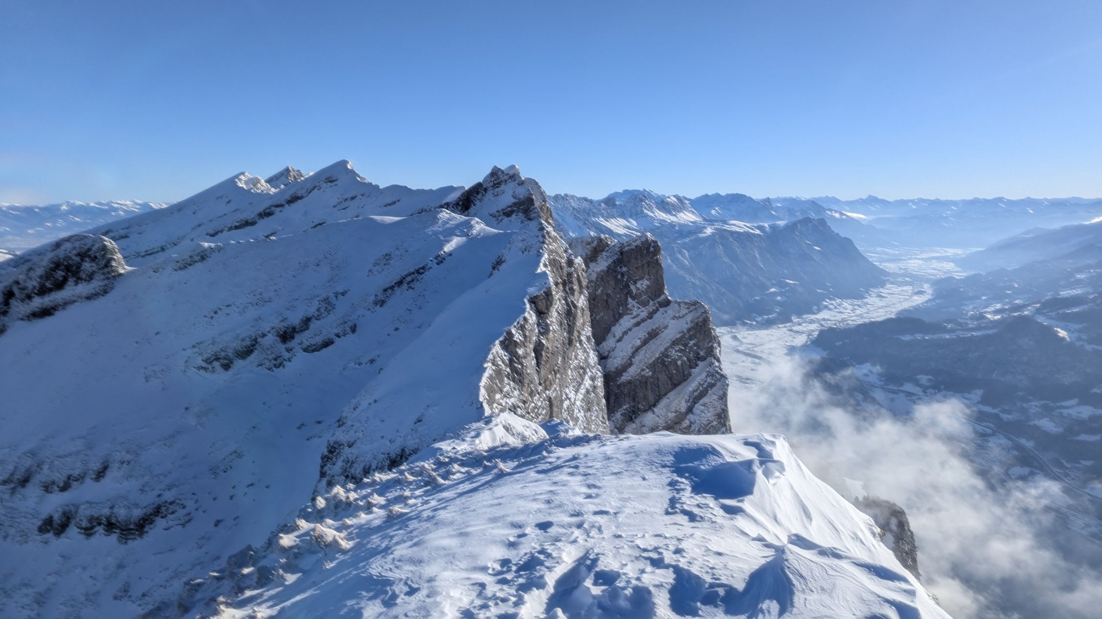 Gute Verhältnisse bezieht sich auf das Gesamterlebnis. Bis Looch und im Abstieg ab Vorder Höhi gings gut ohne Schneeschuhe. Der Aufstieg zum Leistchamm dann in der NW-Flanke 40cm lockerer Pulver, Unterlage für Schneeschuhe sehr rutschig, teils nicht mal tragend. Mühsam hoch zum Tritt und dann entlang des zu erahnenden Sommerwegs auf den Grat. Der dann gut windverblasen ist, hart und rutschig.