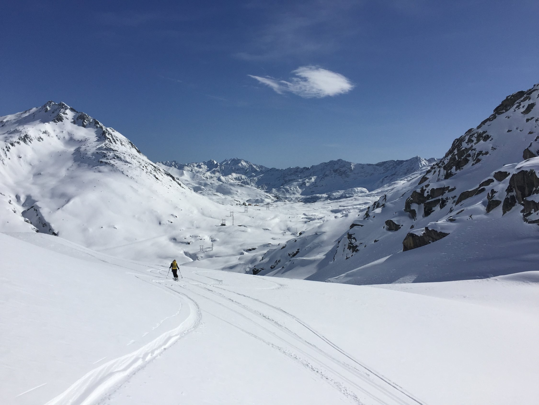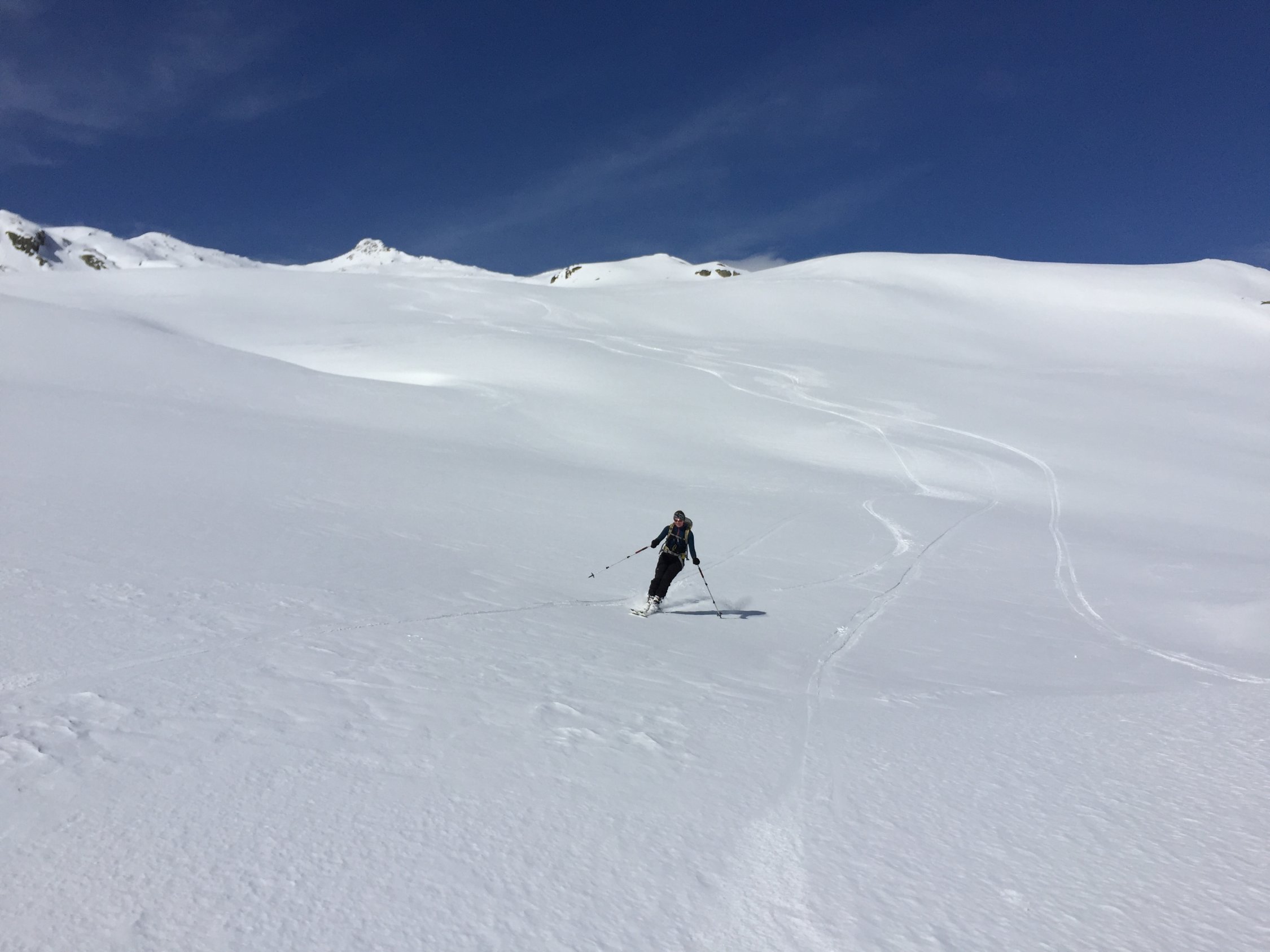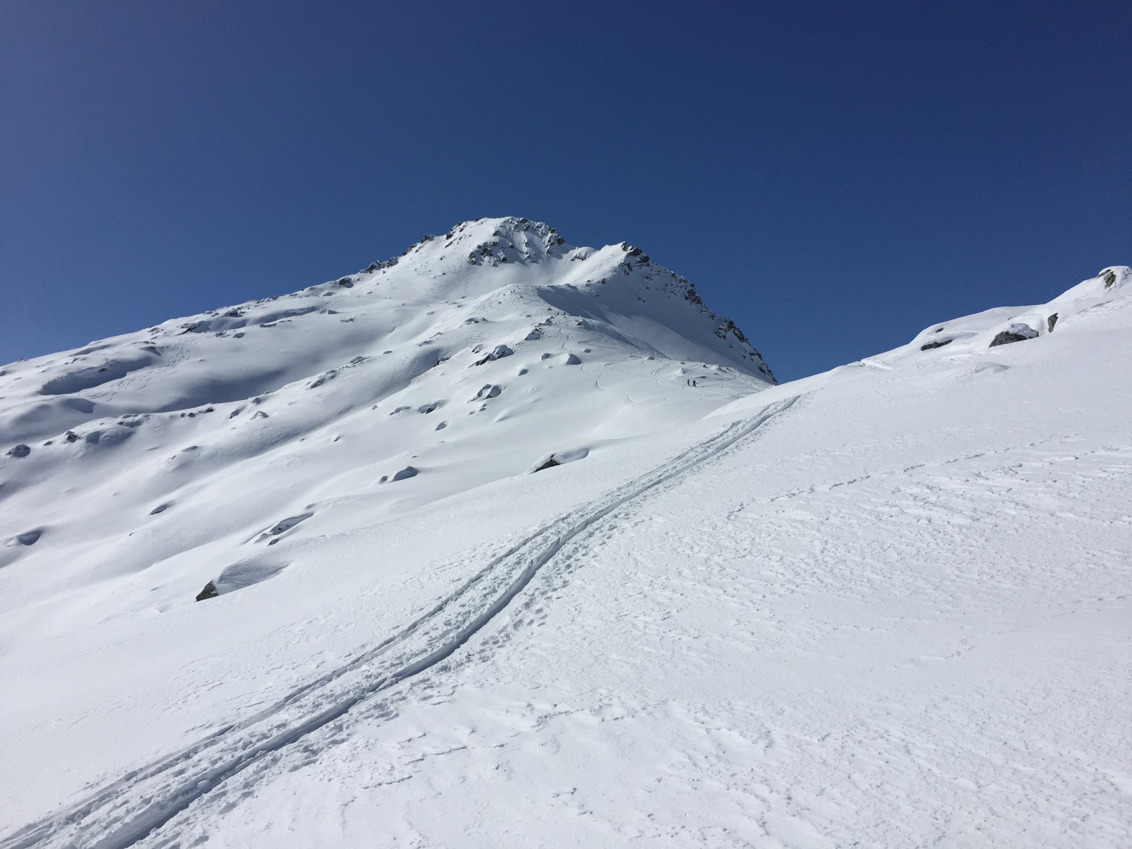 Auch am Winterhorn hat der Regen der vergangenen Woche seine Spuren hinterlassen. Beim Aufstieg von Hospental über den Rücken zieht sich der gefrorene Schnee bzw. Bruchharsch unterschiedlichster Güte bis ca. 2000m. Danach fehlt die Kruste, der Schnee wird fast pulvrig, aber immer wieder auch windgepresst. Wir haben uns daher für die heute kaum besuchte süd- bzw. ostseitige Abfahrt auf der Route 950b zur Gotthardpassstrasse entschieden, auf der heute besonders im untern Bereich schöne Firnverhältnisse anzutreffen waren.
