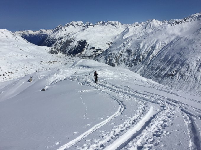 Auch am Winterhorn hat der Regen der vergangenen Woche seine Spuren hinterlassen. Beim Aufstieg von Hospental über den Rücken zieht sich der gefrorene Schnee bzw. Bruchharsch unterschiedlichster Güte bis ca. 2000m. Danach fehlt die Kruste, der Schnee wird fast pulvrig, aber immer wieder auch windgepresst. Wir haben uns daher für die heute kaum besuchte süd- bzw. ostseitige Abfahrt auf der Route 950b zur Gotthardpassstrasse entschieden, auf der heute besonders im untern Bereich schöne Firnverhältnisse anzutreffen waren.