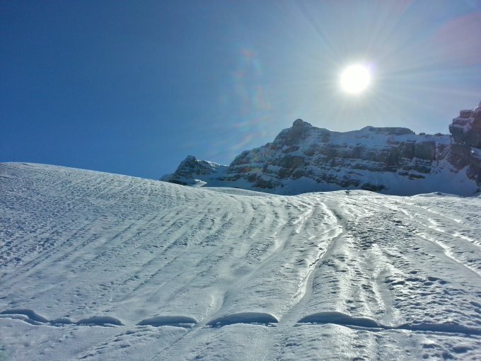 Für einmal lohnte es sich nicht, früh aus den Federn zu kriechen...denn es machte überaus Sinn, bei den derzeitigen Verhältnissen (harter Schneedeckel beinahe bis zum Gipfel plus Regenrinnen, die fast so mühsam wie Zastrugis sind) auf das Sülzli zu warten! Und es kam ab 14 Uhr in den sonnenzugewandten Seiten. Und dann herrschten plötzlich beste Frühlingstourenverhältnisse, die mich gar verleiteten, oberhalb der Lufthütte nochmals die Felle aufs Splitboard aufzuziehen und eine "Ehrenrunde" auf den ..