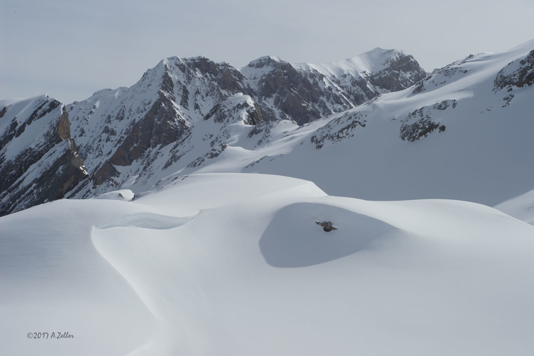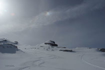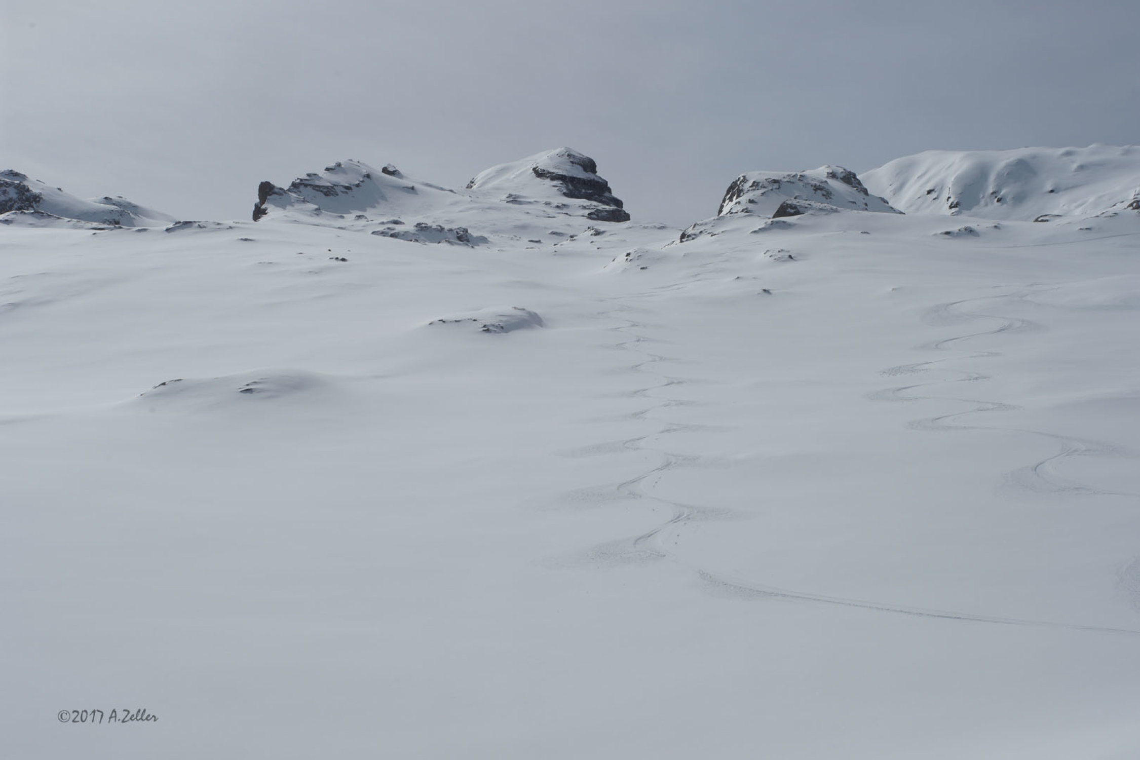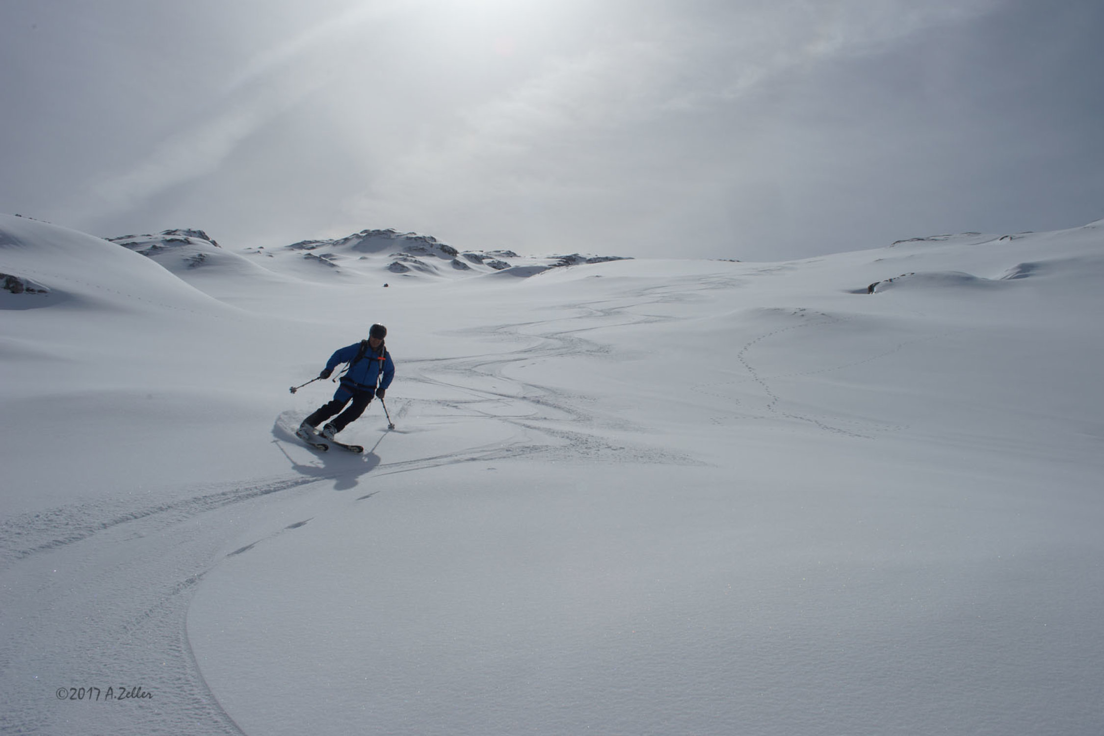 Schnee: Ganze Route gut eingeschneit und durchgehend (mit Ausnahme Couloir) mit Skis begeh-/befahrbar. Tragend hart bis 2100m, darüber tragend hart mit seidenfeiner Pulverschneeauflage 2-5cm. Es hat vergangene Woche wohl bis auf über 200m hinauf geregnet, daher im Bereich 1900m - 2300m harte Regenrinnen, unproblematisch zu fahren. Die ganze Abfahrt war mit Ausnahme von einem kurzen Bruchharschbereich auf 2000m einfach wunderbar!