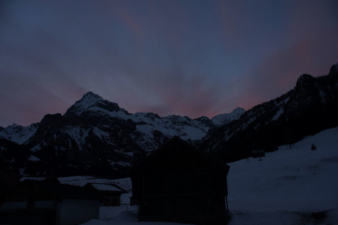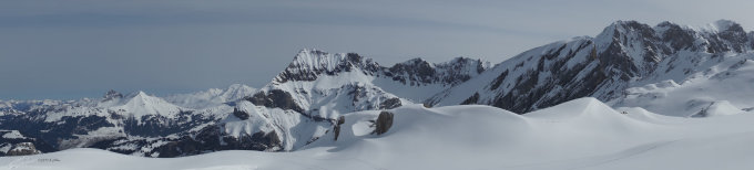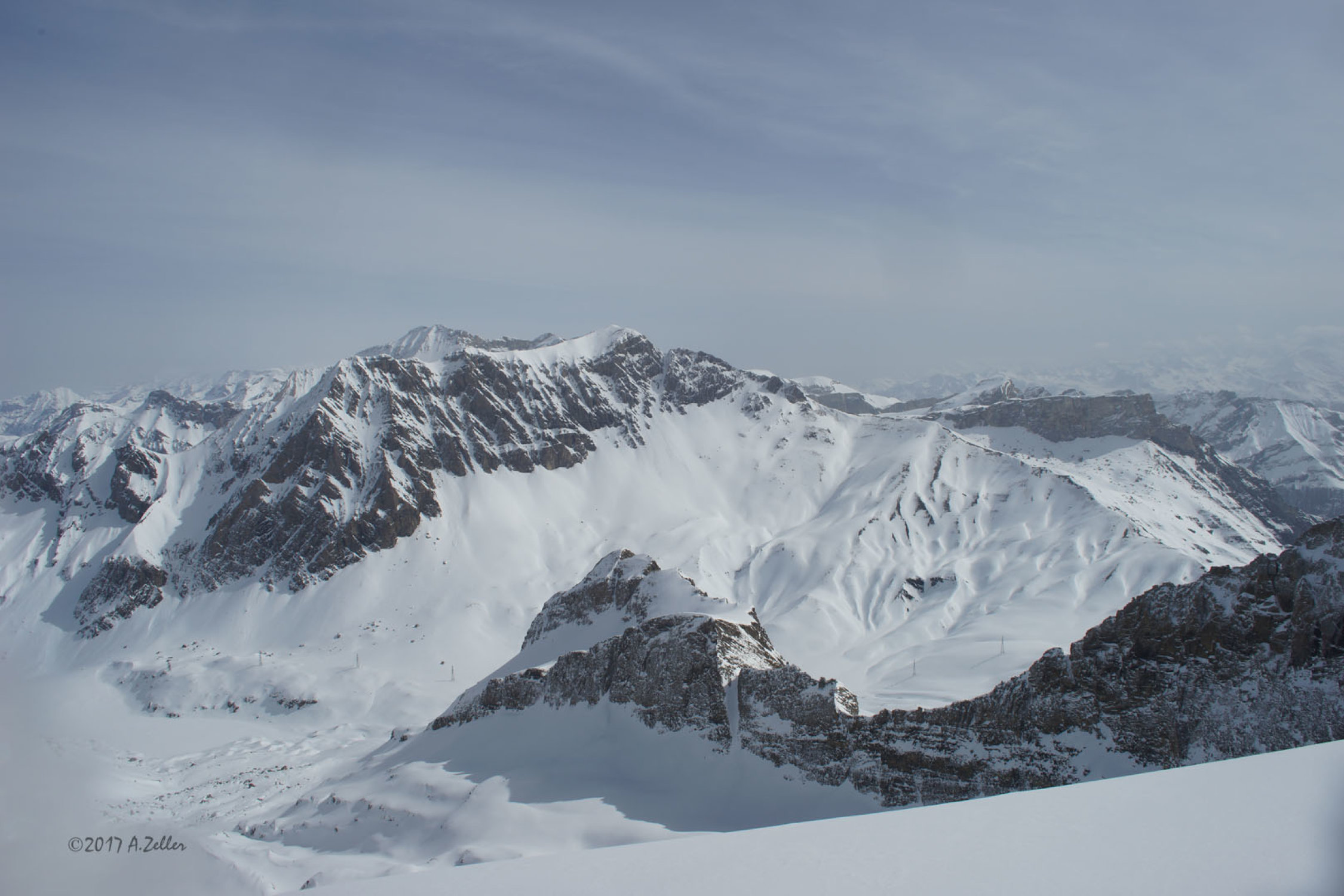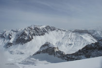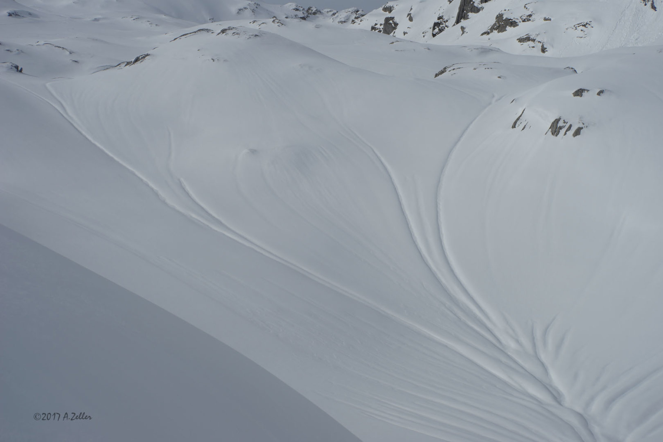 Schnee: Ganze Route gut eingeschneit und durchgehend (mit Ausnahme Couloir) mit Skis begeh-/befahrbar. Tragend hart bis 2100m, darüber tragend hart mit seidenfeiner Pulverschneeauflage 2-5cm. Es hat vergangene Woche wohl bis auf über 200m hinauf geregnet, daher im Bereich 1900m - 2300m harte Regenrinnen, unproblematisch zu fahren. Die ganze Abfahrt war mit Ausnahme von einem kurzen Bruchharschbereich auf 2000m einfach wunderbar!