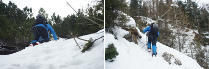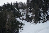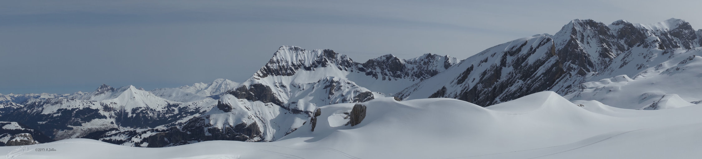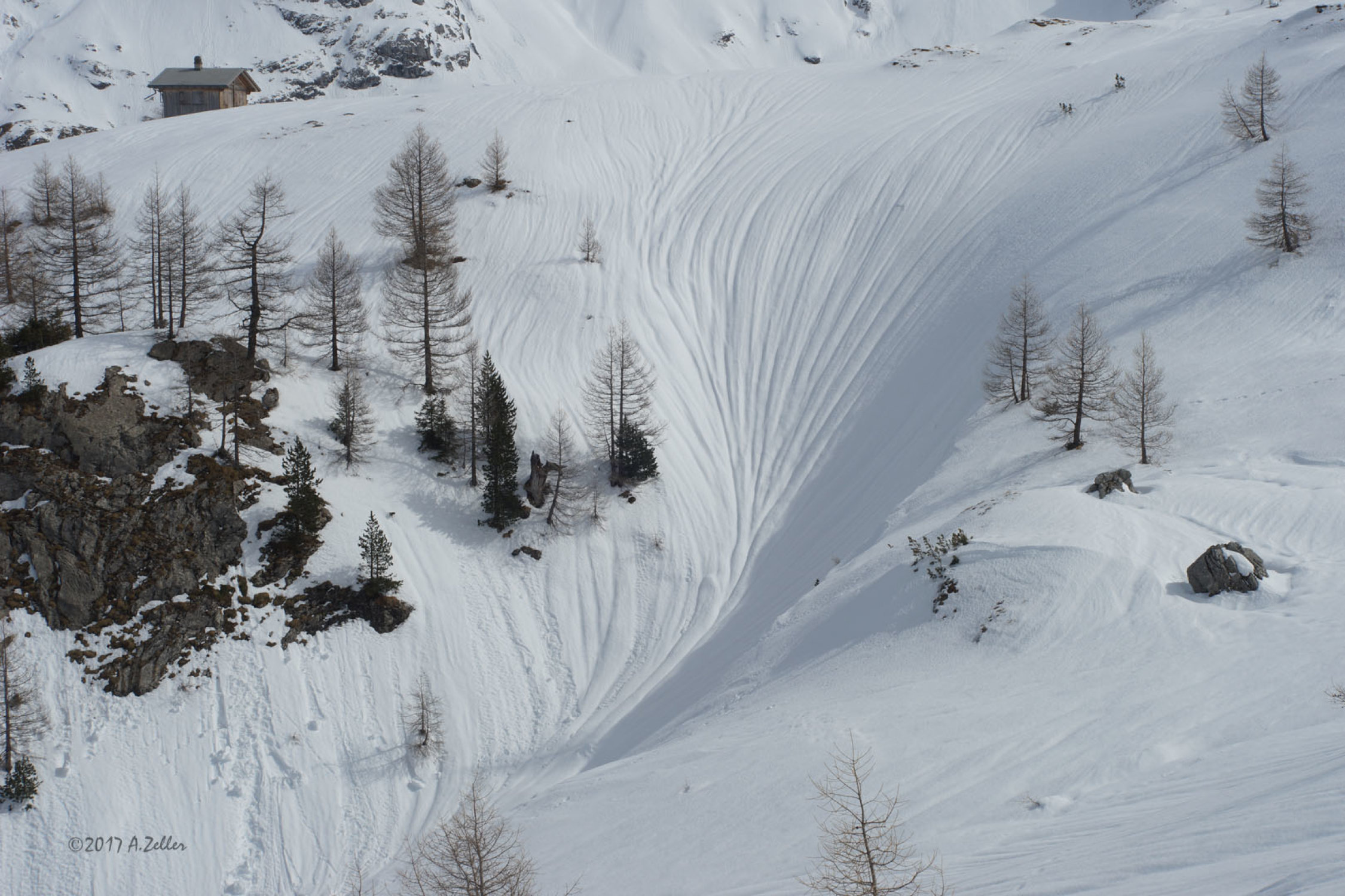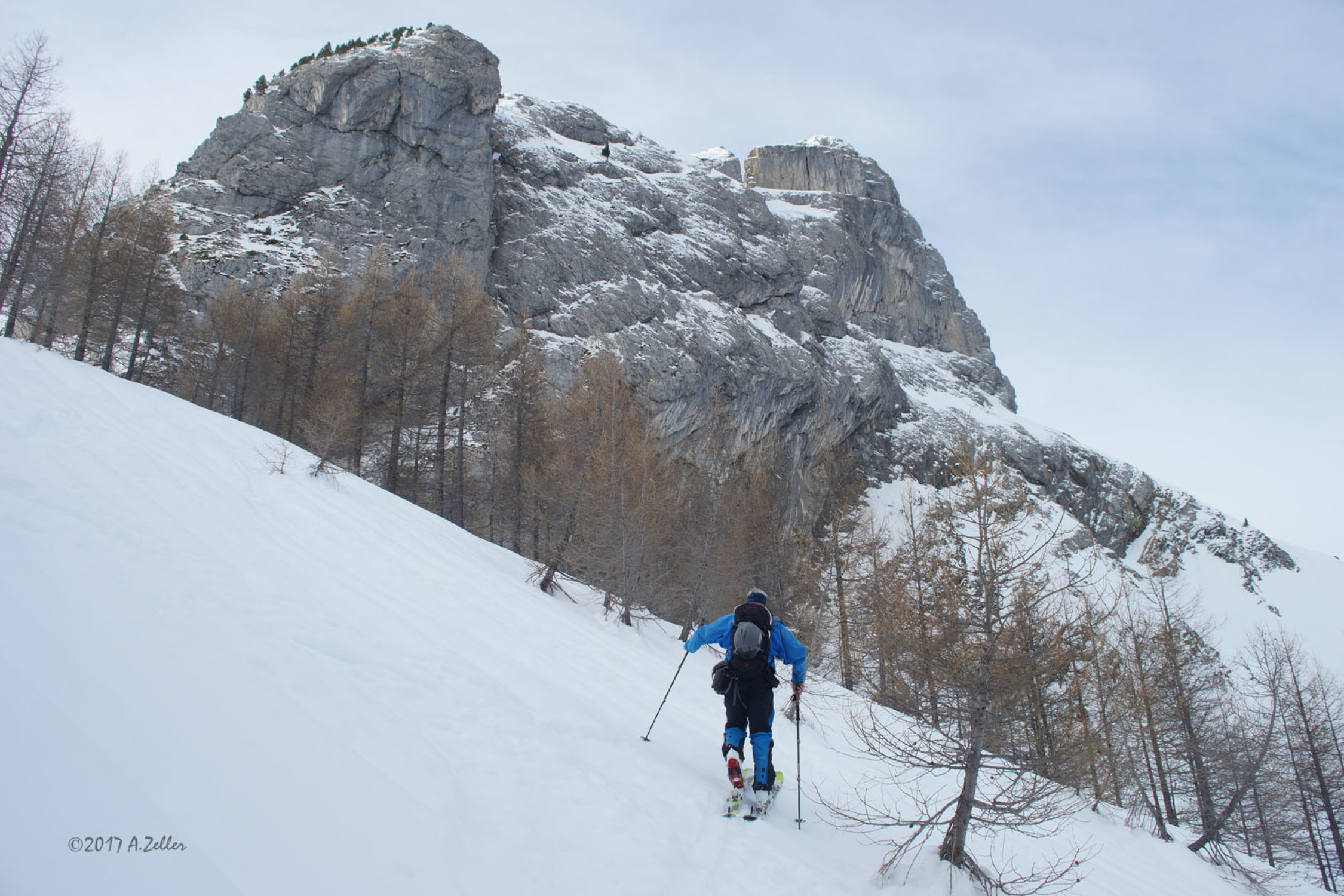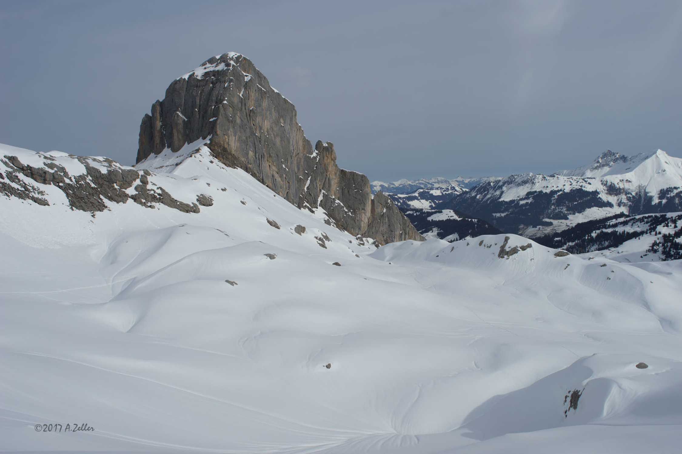 Abfahrt: Der Aufstiegsspur entlang zurück bis zum Couloir, welches man meist abrutschend passieren kann. Über schöne Hänge von Topfel - Lätzi Weid und kurz über den alten Fussweg von Osten durch den Wald zum Skilift und zurück zum Ausgangspunkt.