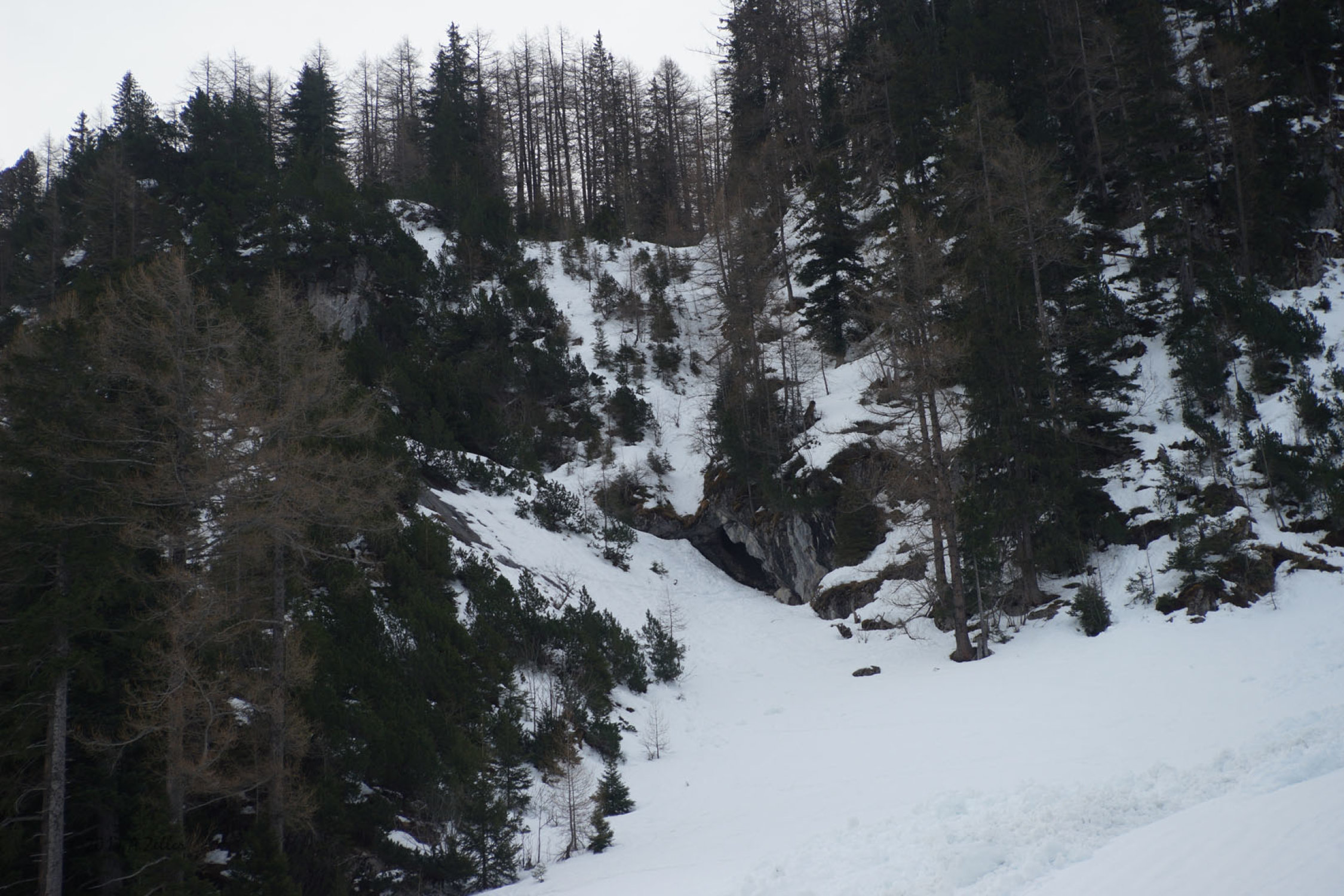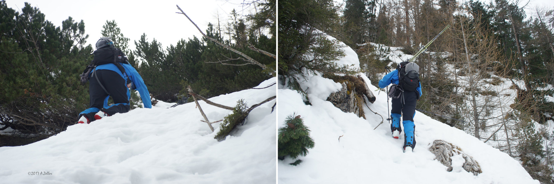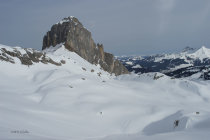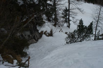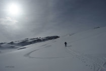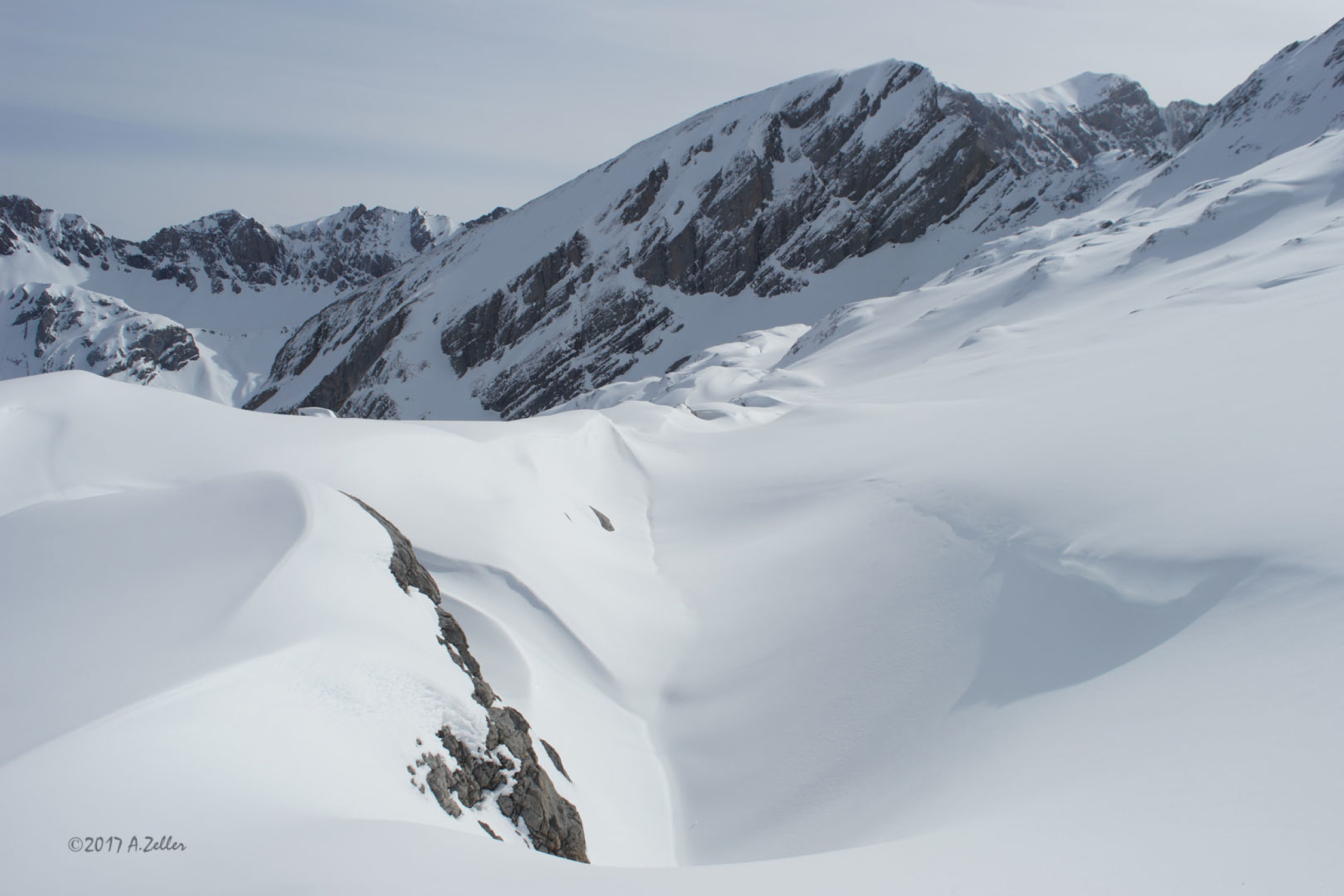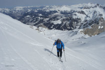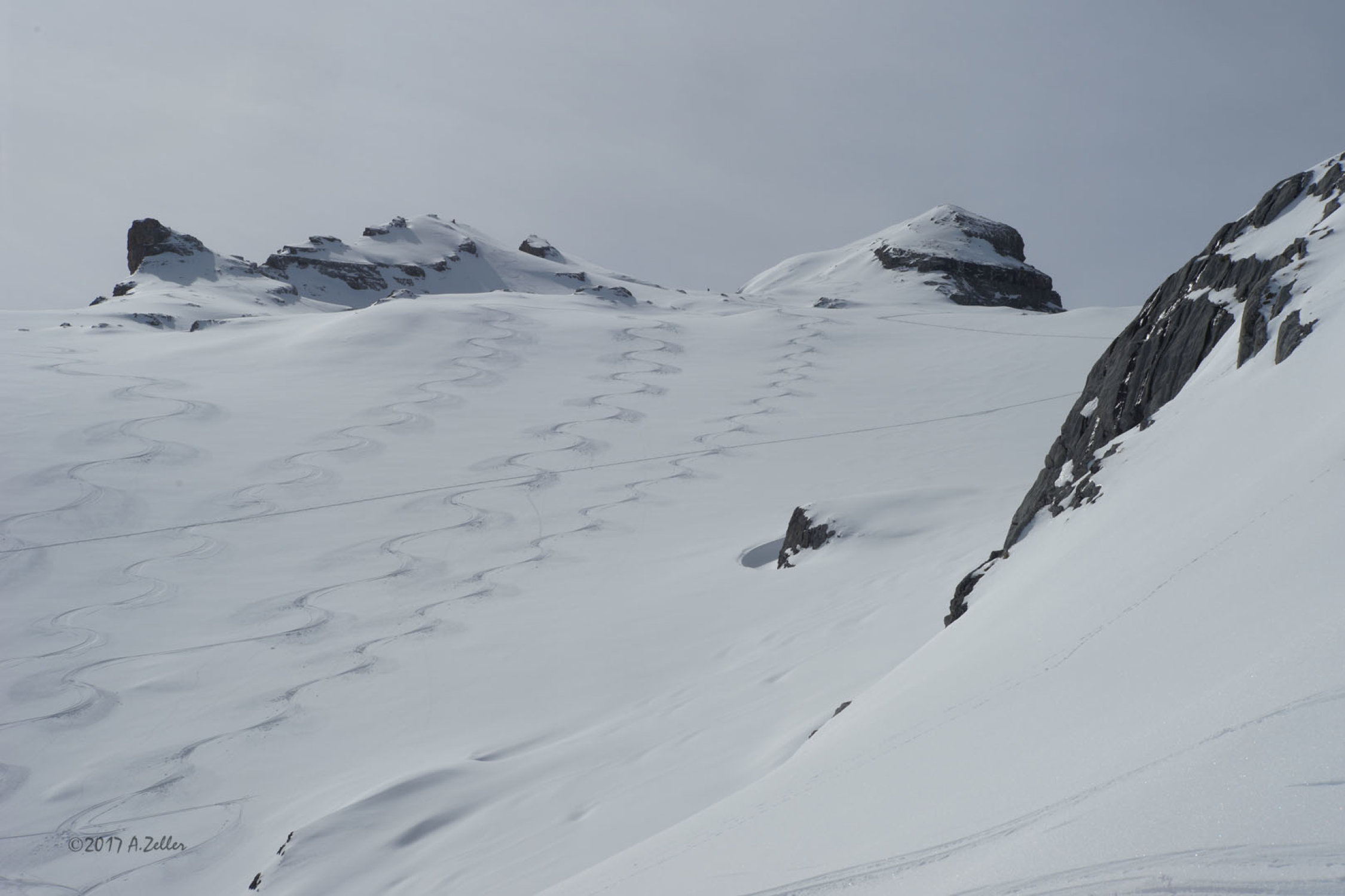 Couloir: Im Aufstieg hart und guter Trittschnee, daher an der steilsten Stelle zu Fuss gemacht. In der Abfahrt weicher Schnee und abrutschen gut machbar (kurz etwas ausgesetzt)