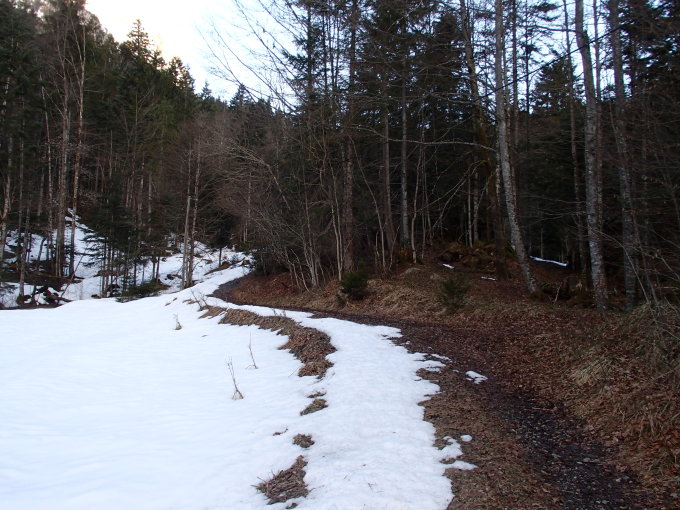 Ski anschnallen ab Parkplatz möglich. Im Wald Aumeindli 2 Tragpassagen à ca. 50m. Rest durchgehend schneebedeckt.