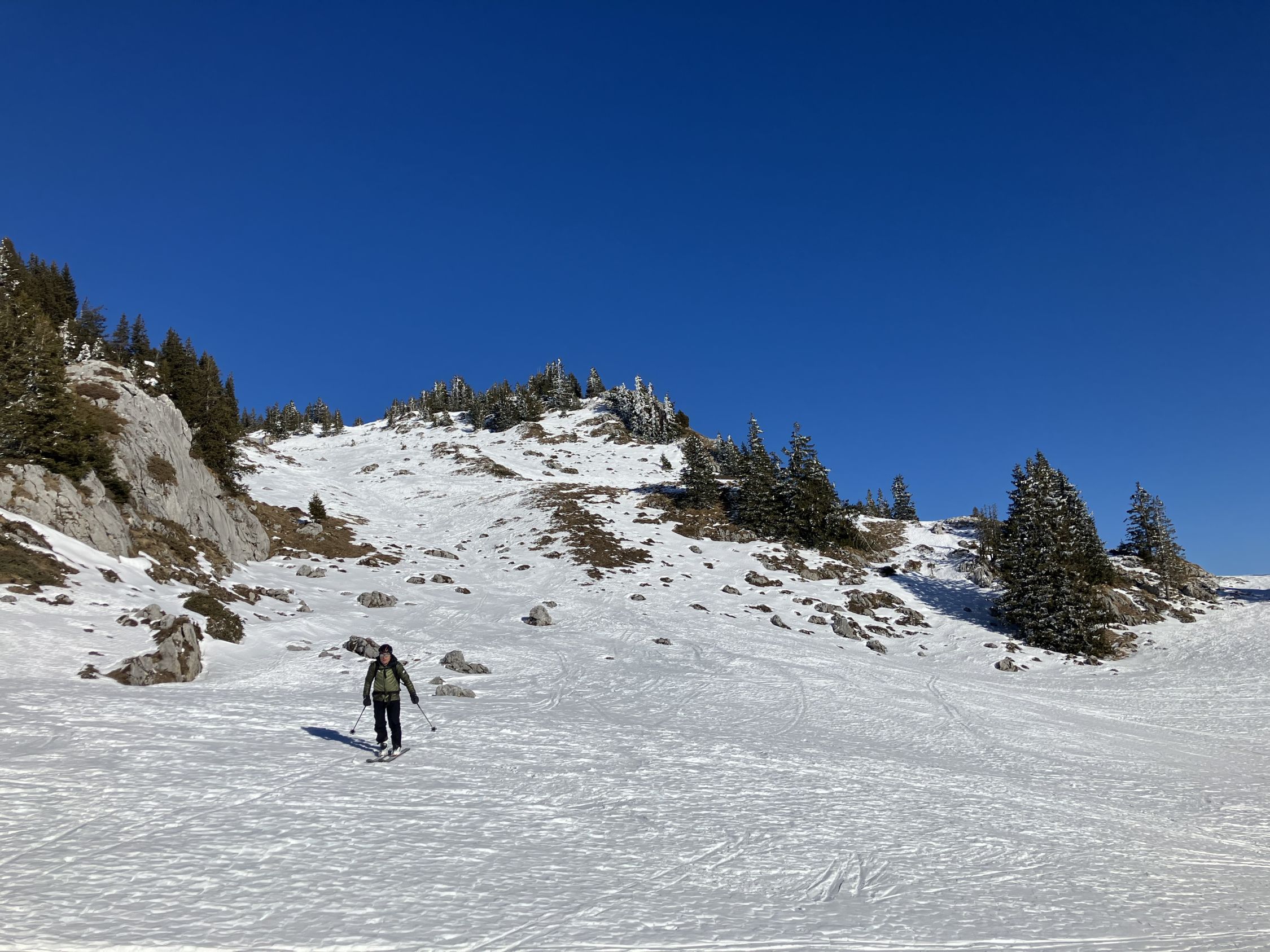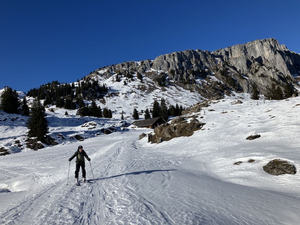 Start bei -12 Grad, Strasse fast durchgehend schneebedeckt, sehr bequem. Steilhang auf 1900m hart und rutschig, evt. Harscheisen montieren. Gipfel abgeblasen. Abfahrt oben hart, ab Obergestelen gäbig, feines Schümli auf harter Unterlage. Abkürzung im Wald nach dem Brätliplatz nicht zu empfehlen, besser auf der Strasse bleiben. Gut bezieht sich auf die zur Zeit sehr begrenzte Auswahl von Touren unter 2000m.