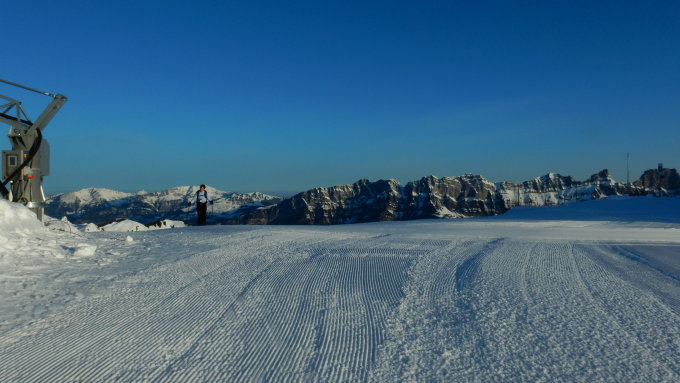 Pulver bis 1900 müM, darunter Regenrinnenschnee. Sulzschnee auf dem Rückweg zum Maschgenkamm und auf der Piste zur Tannenbodenalp.