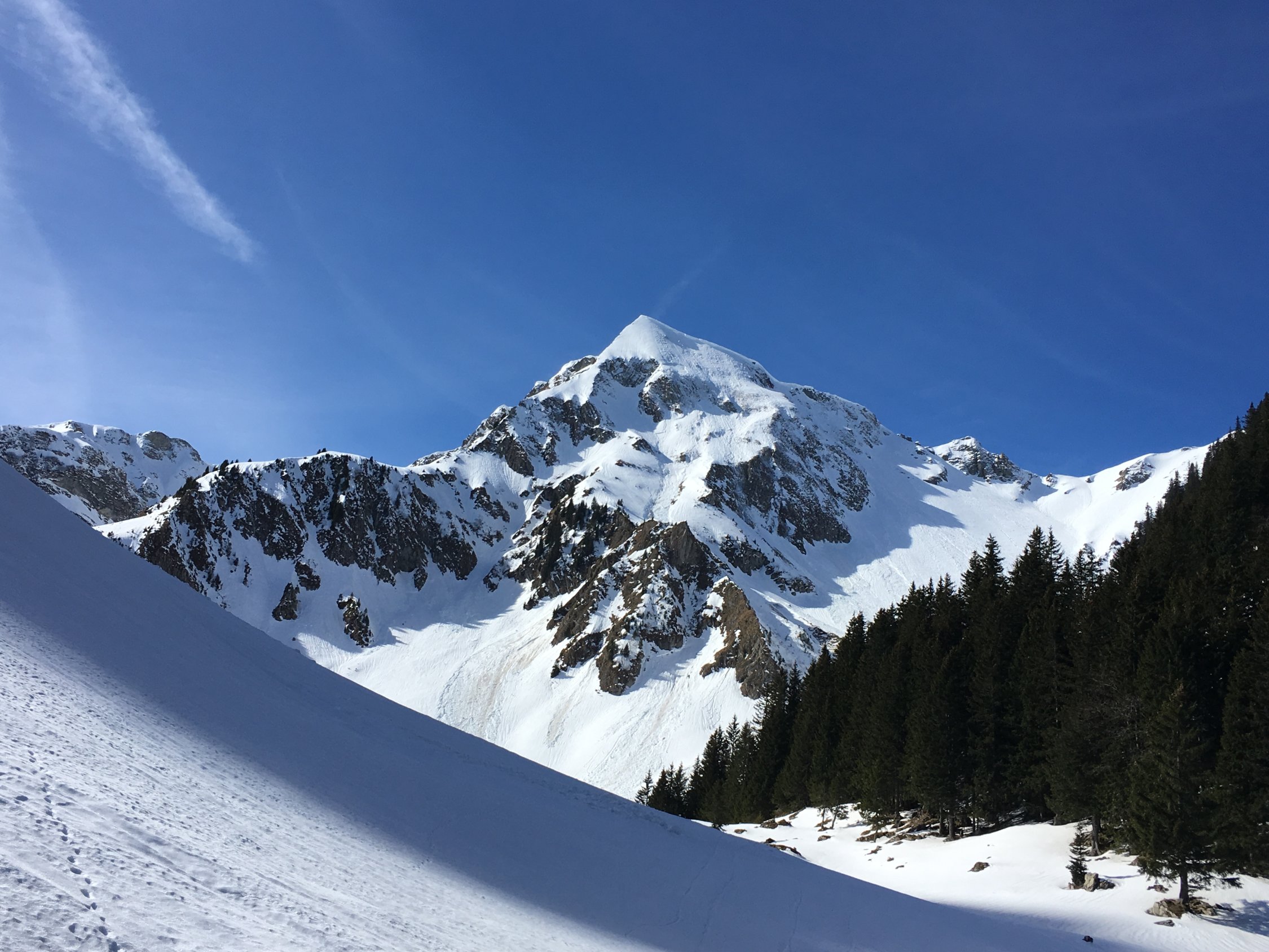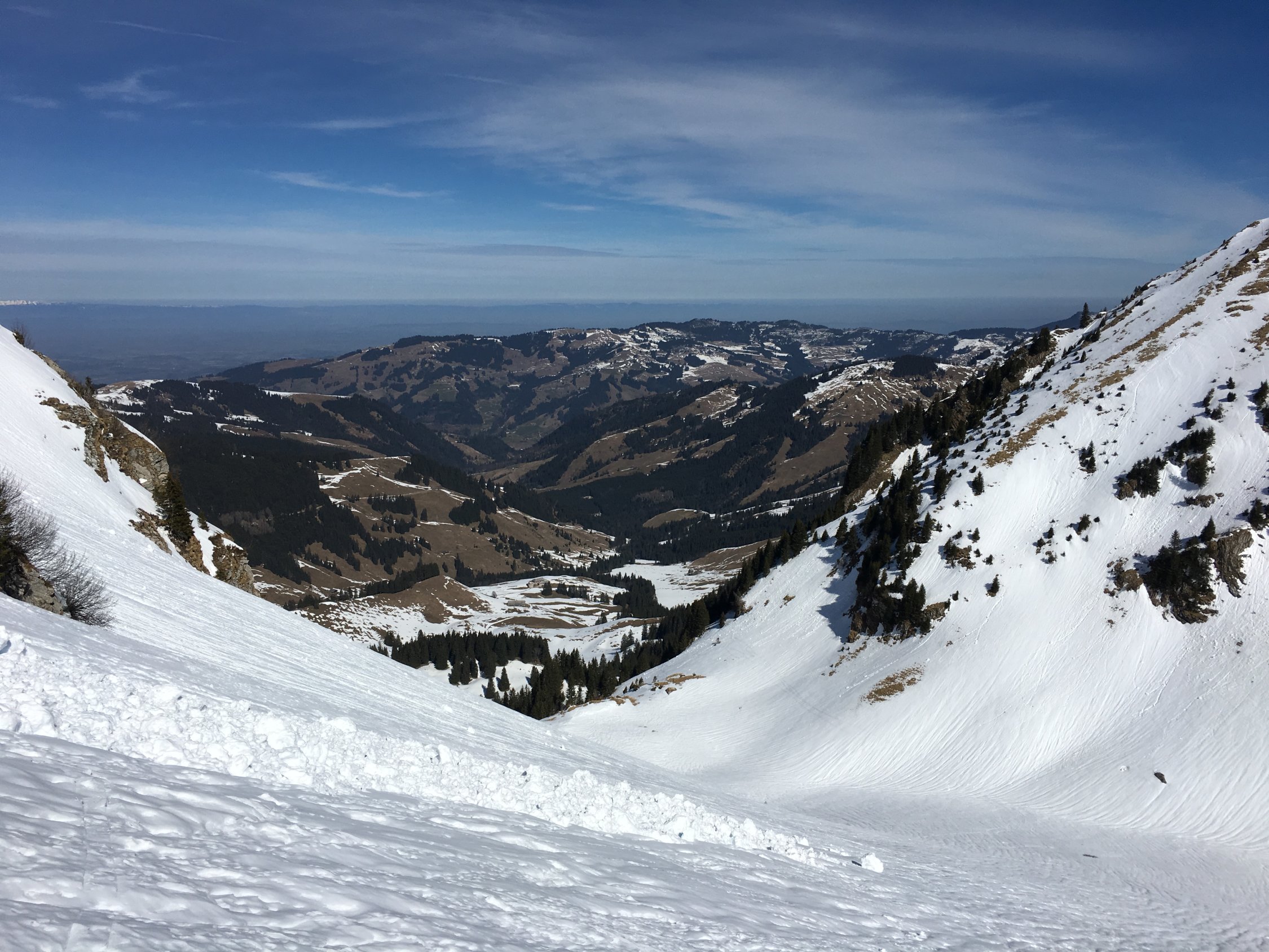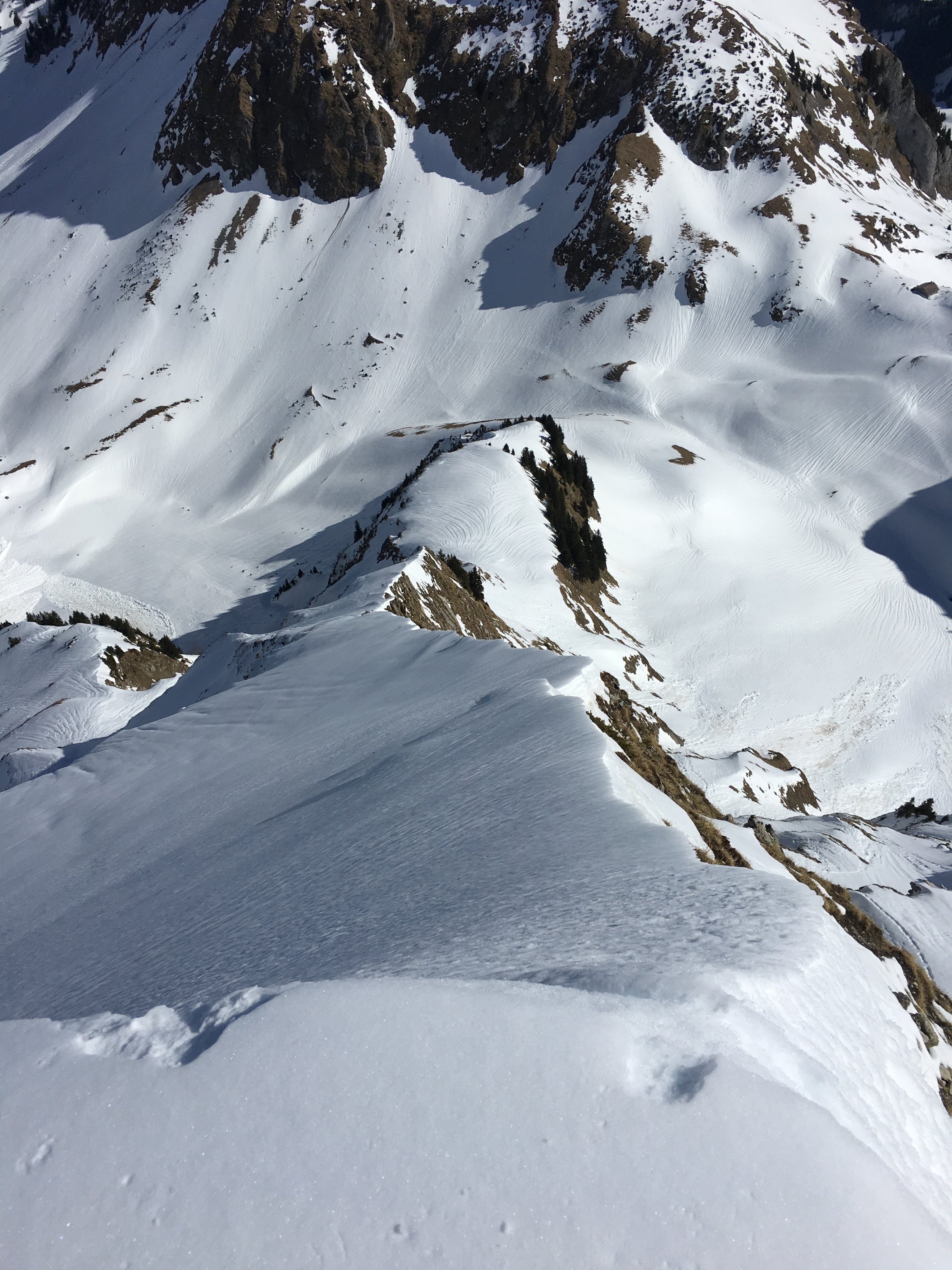 Aufstieg und Abfahrt nordseitig. Überall an der Sonne schöne Frühlingsverhältnisse, aber nordseitig, wo es nicht unbedingt aufsulzt, bleiben teilweise harte, lawinendurchfurchte Eisrinnen oder generell Hartschnee mit wenig Grip. Das Gebiet ist gut eingeschneit und mit Ski lückenlos ab Brücke im Muscherenschlund p.1193 begehbar