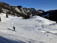 Start bei -12, Strasse fast durchgehend schneebedeckt, angenehmer Aufstieg. Nur beim Steilhang auf 1900m etwas rutschig, Eisen von Vorteil. Gipfel abgeblasen. Abfahrt oben hart, ab Obergestelen ein Schümli Pulver auf harter Unterlage. Ab Brätliplatz auf der Strasse, Abkürzungen nicht zu empfehlen. Gut bezieht sich auf die zur Zeit sehr eingeschränkte Auswahl von Touren unter 2000m.