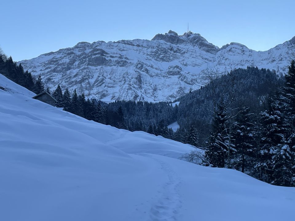 Tourenbeginn um 08:35 Uhr bei -16°C unter klarem Himmel. Es wehte ein leichter Zug aus Süden. Im Bereich Güenau lagen ca. 10 cm Pulverschnee vom letzten Tag, ab der Höhe vom Gschwendsattel ca. 20 cm. Eine verschneite Schneeschuhspur gab es auf dem Lillyweg von der Brücke über die Urnäsch bis Gerstengschwend. Ab dem Rechtsabzweig des Sommerweges vom Fahrweg nach Gerstengschwend musste ich bis zum Gipfel hinauf spuren, ebenso hinab bis Ober-Guggeien, wo ich auf frische Spuren traf von 2 Tourenskigängern, welche zur Oberen Petersalp stiegen und von dort gleiche Strecke hinab fuhren.