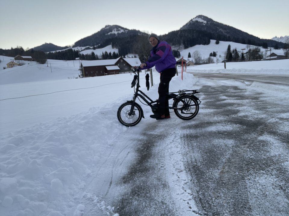 Trotz des schönen, wenn auch kalten Wetters traf ich unterwegs weder Menschen, noch Tiere an. Da mein linkes Bein bei weitem noch nicht so genesen ist, als ich mir wünsche und um mir den 3 km langen Hatscher durch das schattige Tal zurück zum Rossfall zu ersparen, wo es zudem auch keine getretene Spur gab, deponierte ich mein Mini-E-Bike hinter dem Betrieb der Tisca Tischhauser AG bei kleiner Straßenbucht links von der Dürrenstraße. Mit diesem fuhr ich dann im Turbo-Gang am frühen Abend zurück bei -12°C hinauf zum Gasthaus Rossfall.