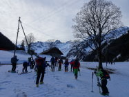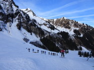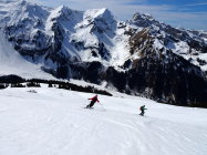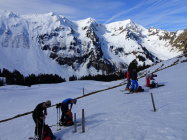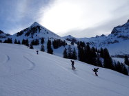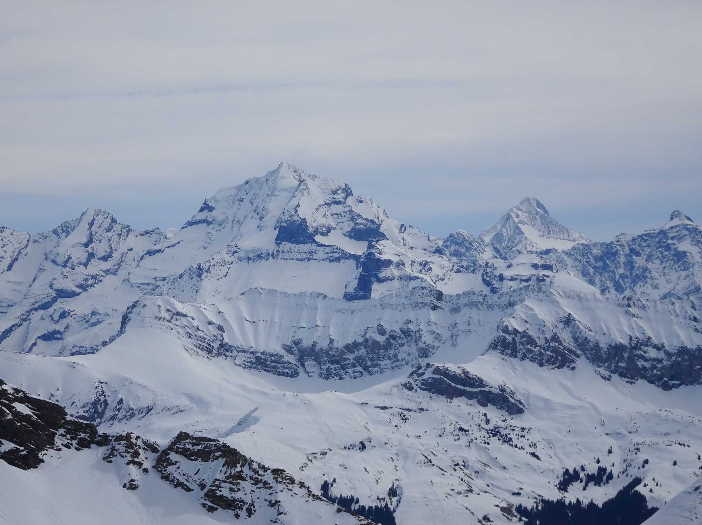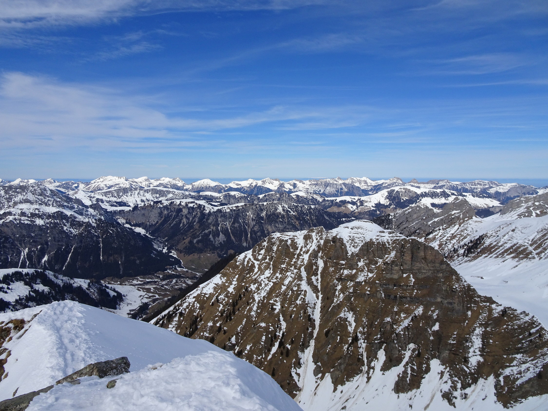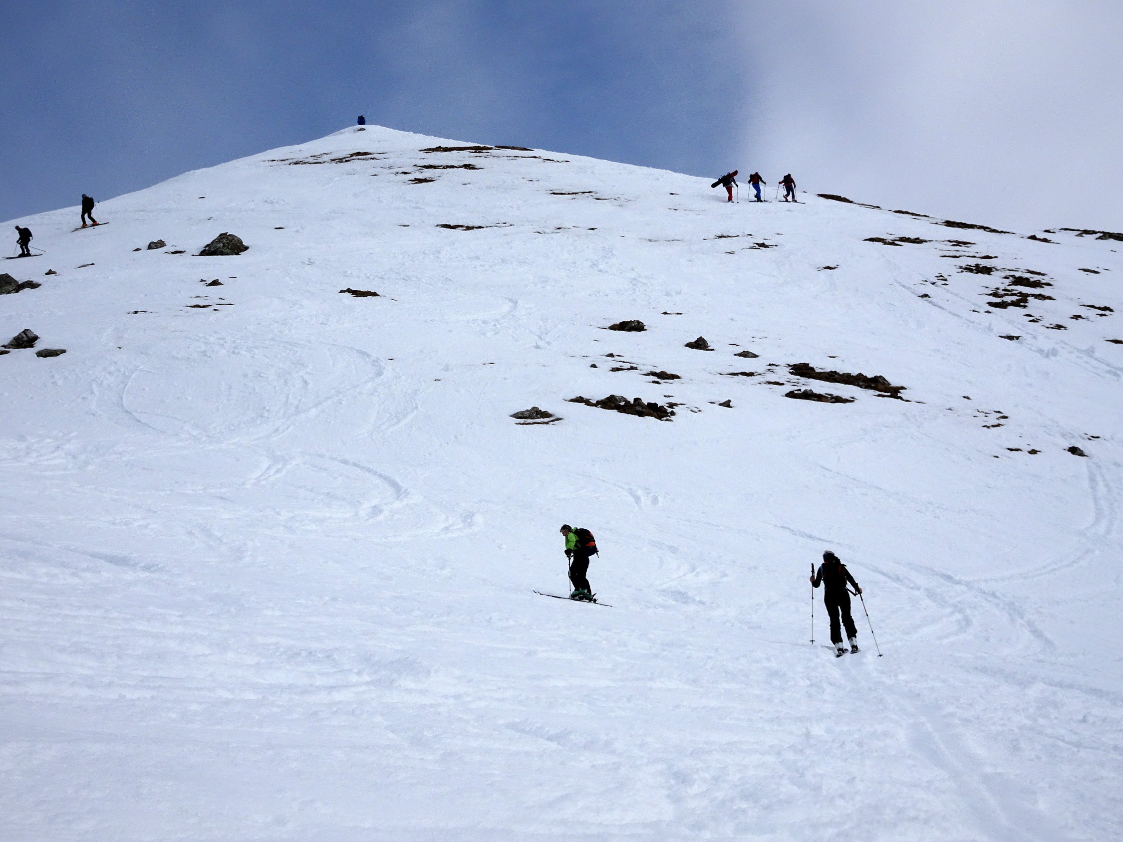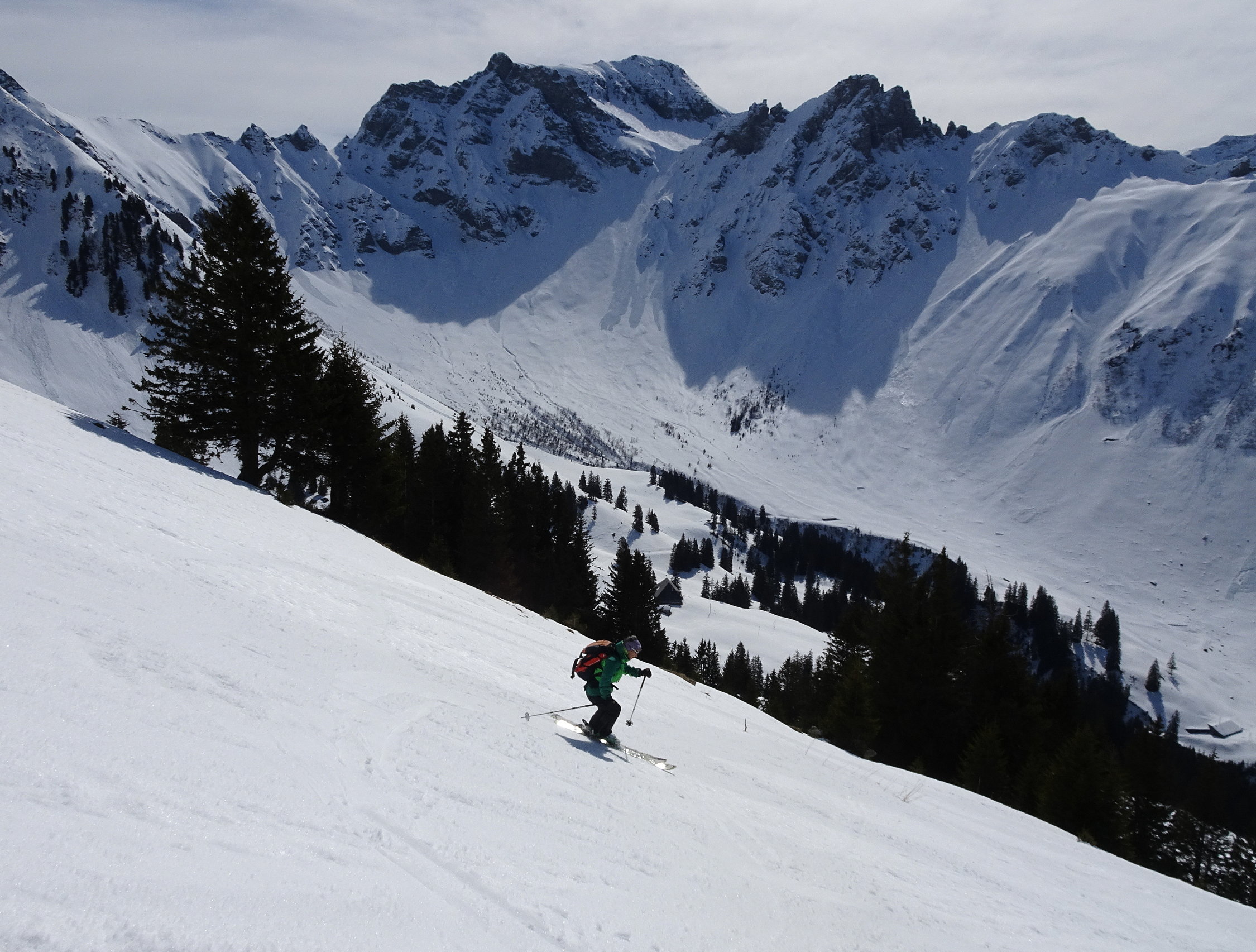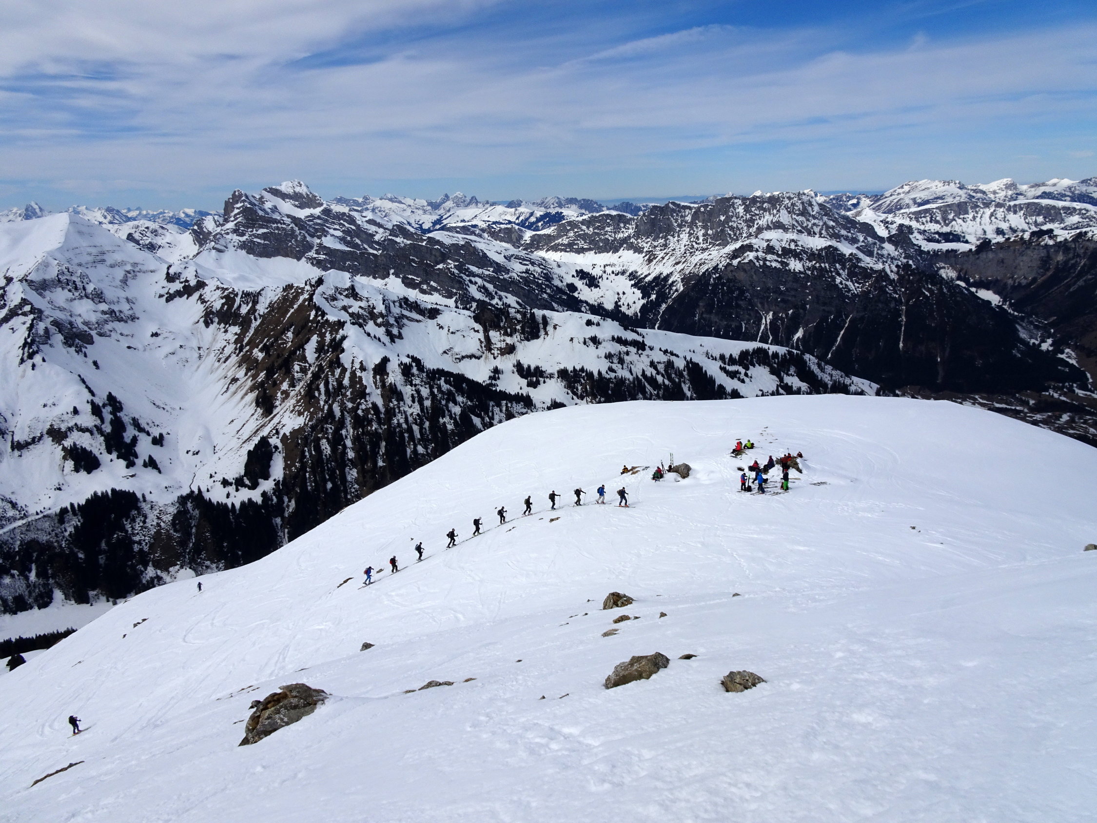 Diesmal hat es doch geklappt. Die Wolke die über die Alpen bis zur Kette Niesen- Männliflue-Gsür und Albristhorn hing, verschaffte uns eine Schattengrenze bis zur Galmschibe (ausgerechnet). Dadurch konnte der Schnee nicht aufsulzen, was bei den Tourenfahrern einiges Stirnrunzeln verursachte. Nach langer Wartezeit, genau um Mittag, verschob sich die Wolke und die Sonne bearbeitete sofort den Schnee. Diese Behandlung verschaffte uns bei der Abfahrt um 12.45 prächtige Sulzverhältnisse. Vorteil der Galmschibe: je nach Sonneneinwirkung kann man sich die Abfahrtroute aussuchen. Wir fuhren vom Skidepot zuerst ganz links (Osten) über fast unverfahrene Hänge hinunter, bis wir durch das Gelände nach rechts zum Haupthang gedrängt wurden. Der Rest war ebenfalls ein Geniessen bis zum Parkplatz in Fildrich. Fährt man zu früh, ist es hart, zu spät ist es zu weich. Scheint die Sonne die ganze Zeit, sollte man unbedingt vor Mittag abfahren.