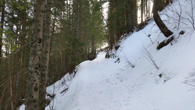 Die Ski müssen bis zur Einmündung der Forststraße Wimbachbrücke getragen werden. Ab hier durchgehende Schneedecke. Forststraße ist geräumt und bereits in der mitte Aper. Man kann noch daneben Abfahren bzw. Aufsteigen.