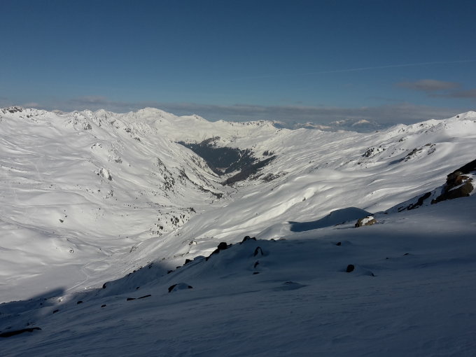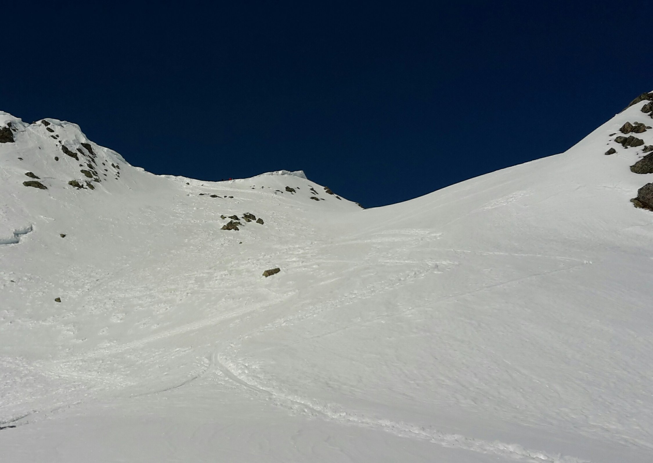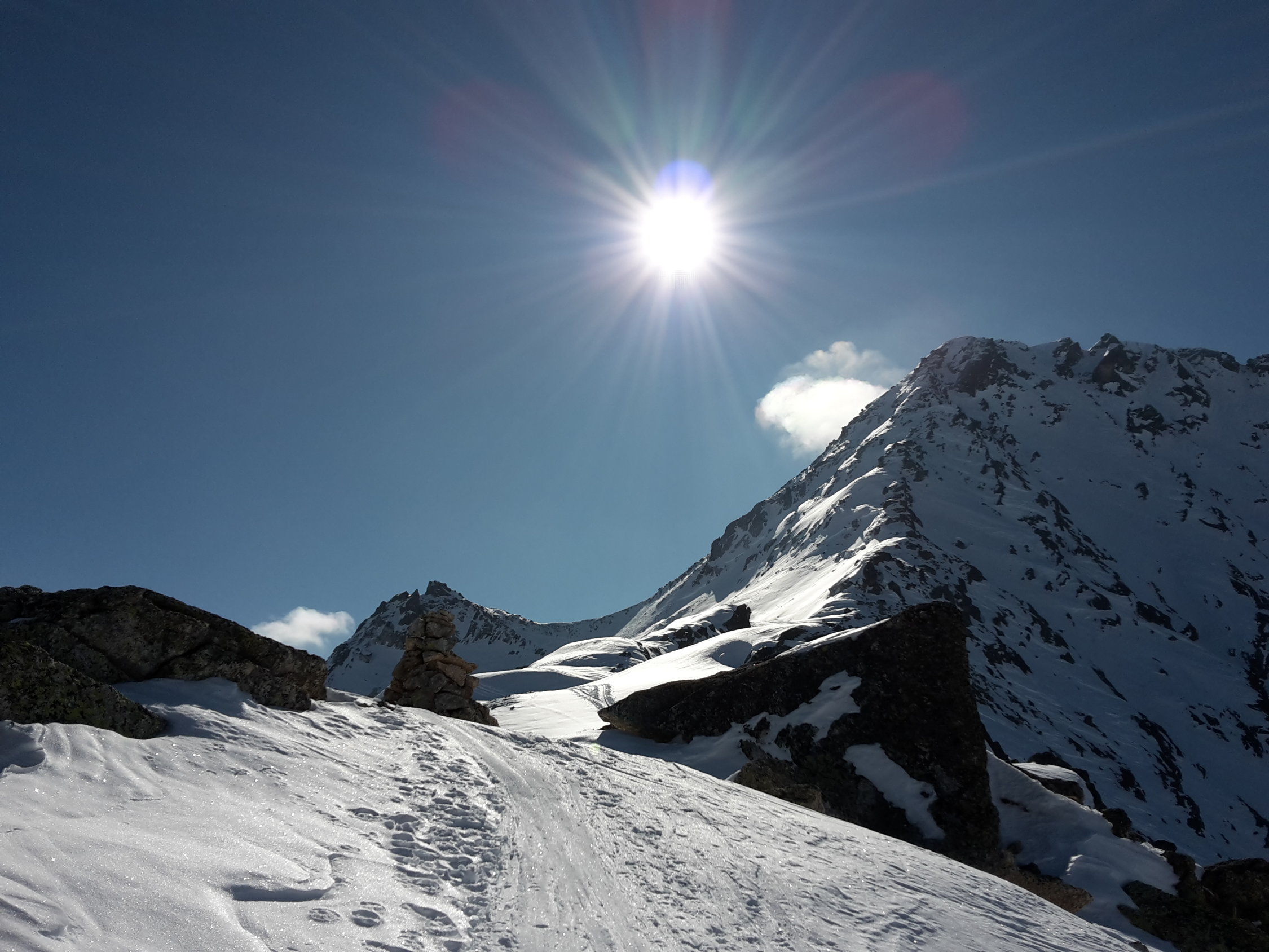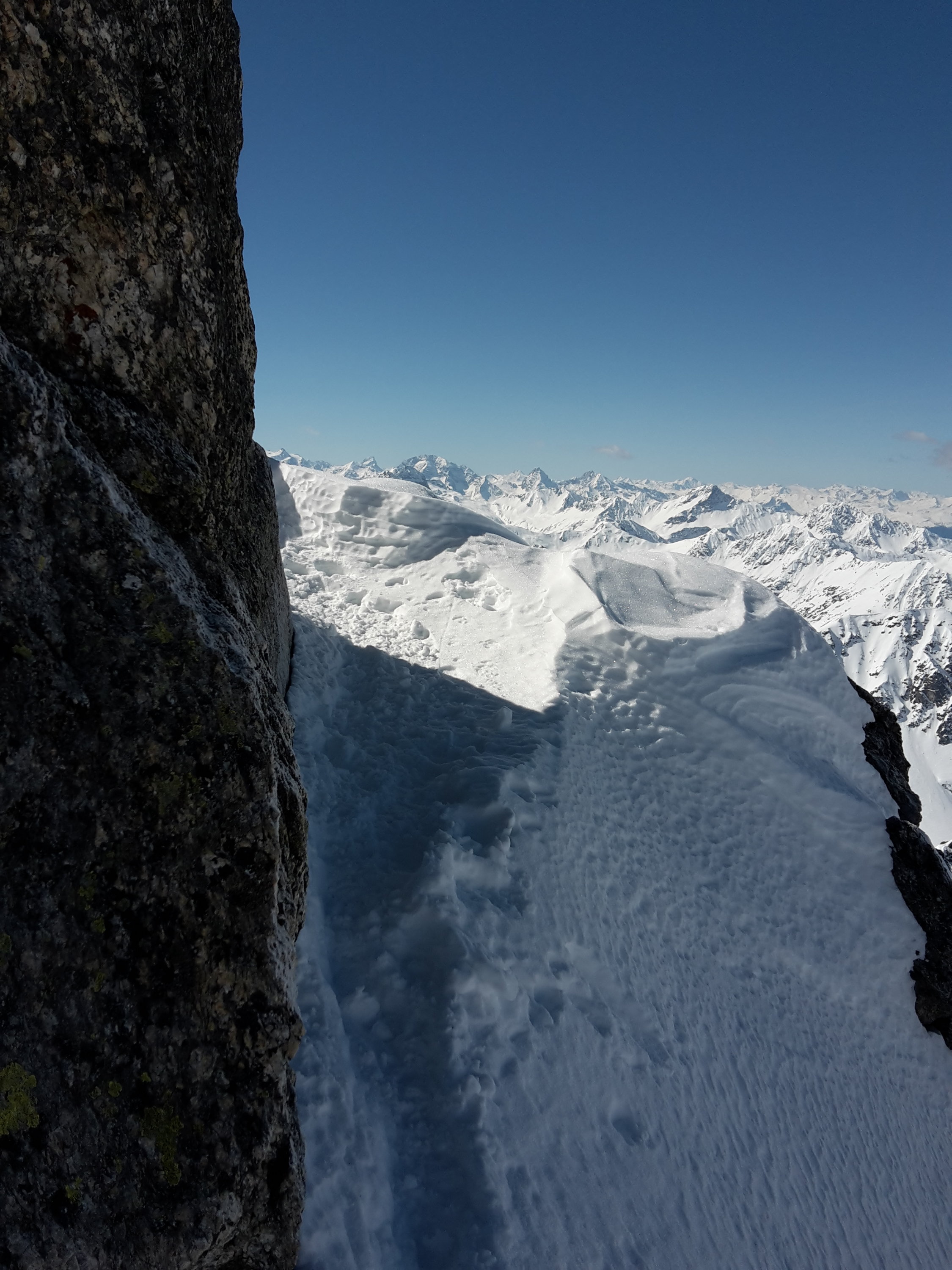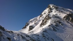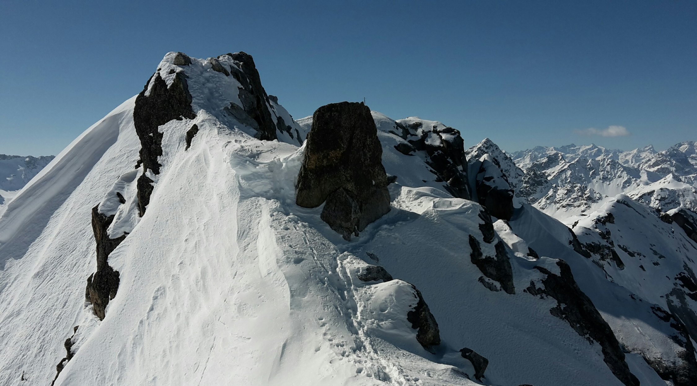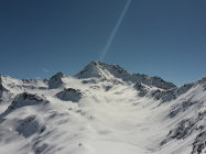 Start um 7:40 im Tschuggen, auf guter Spur (keine Harscheisen benötigt) in 2h zur Winterlücke, Querung zu Pkt 2939 Skidepot, mit Steigeisen und Pickel zum Gipfel, relativ guter Trittschnee.