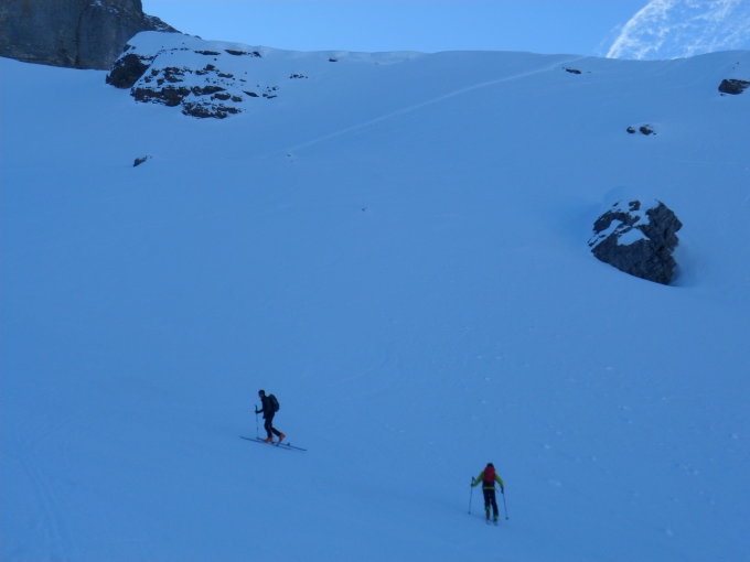 Bis oben am morgen früh tragender Firn. Um 12 Uhr dort wo Sonne hinkommt, leicht aufgesulzt. Ab Skidepot sehr viel Trittschnee. Steigeisen angenehm aber nicht unbedingt notwendig.