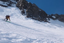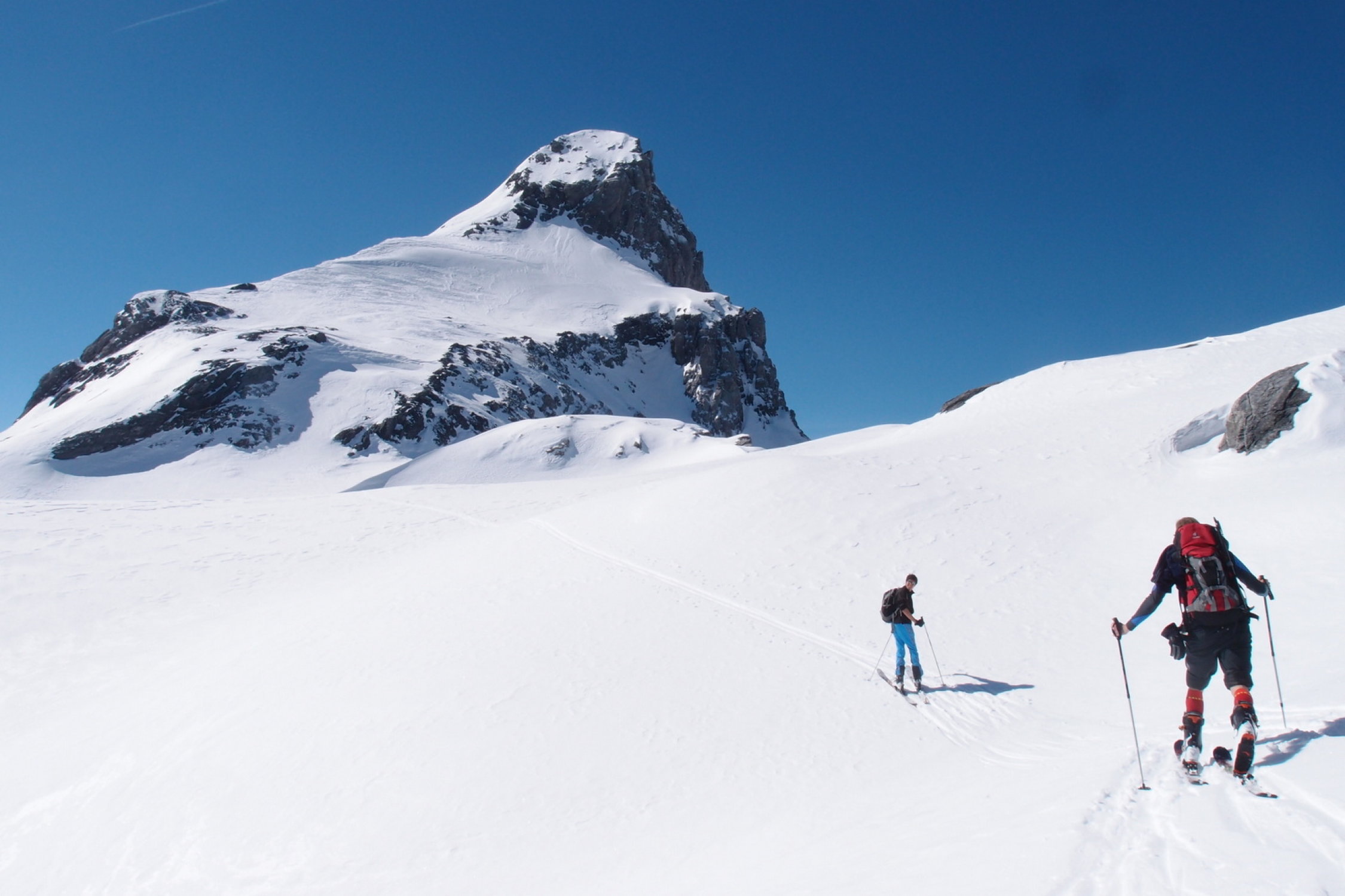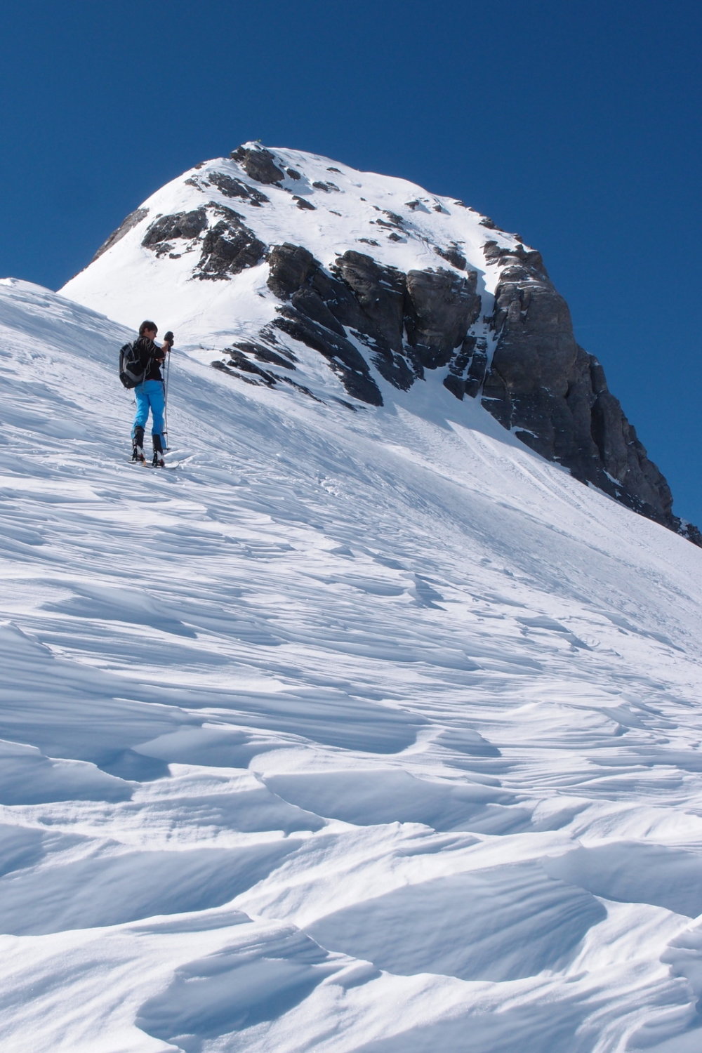 Vom Pass zum Skidepot gut tragend, tw. hart windgepresst. Fussaufstieg ist in meist tiefem Trittschnee gut möglich. Kette ist frei und hilfreich.