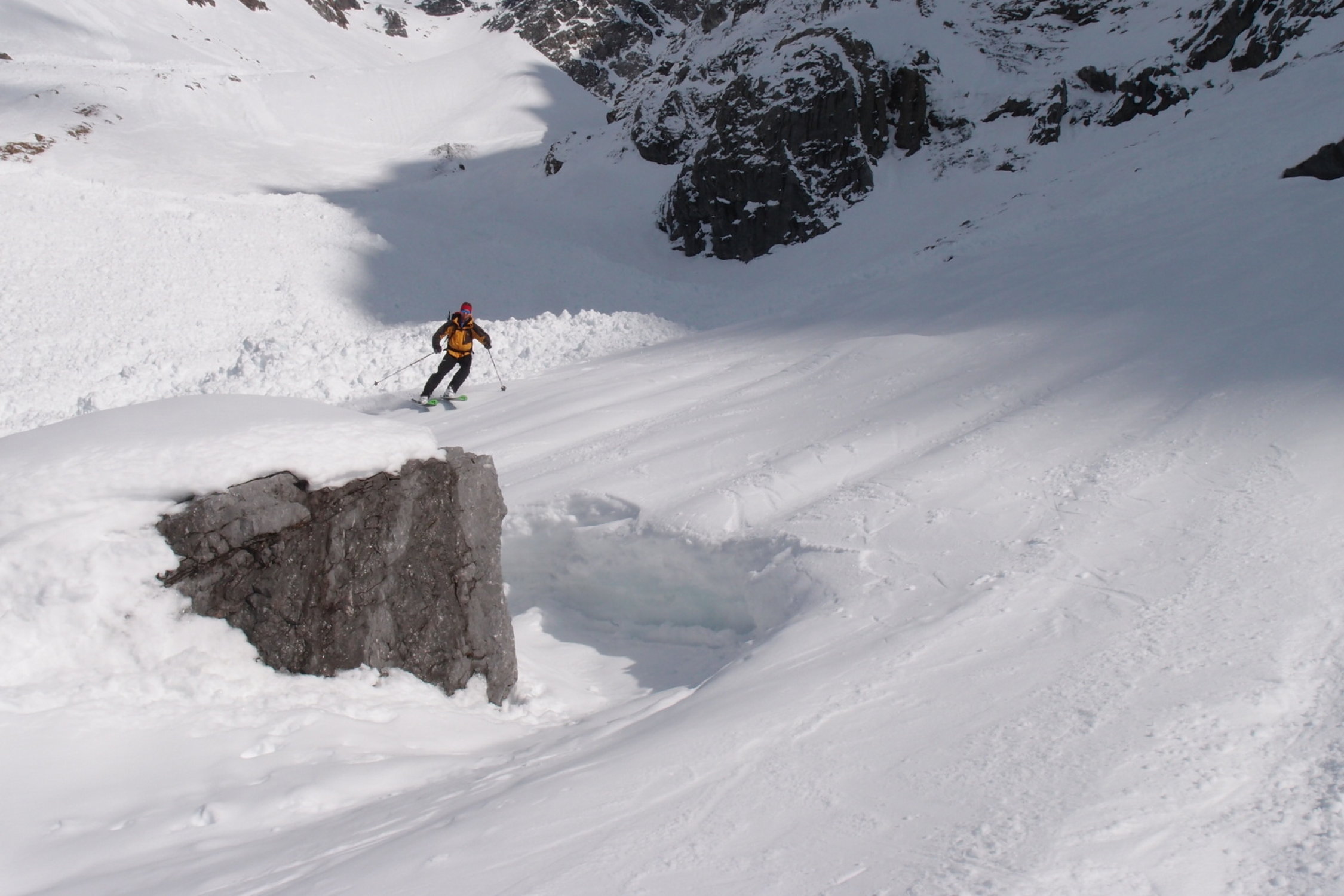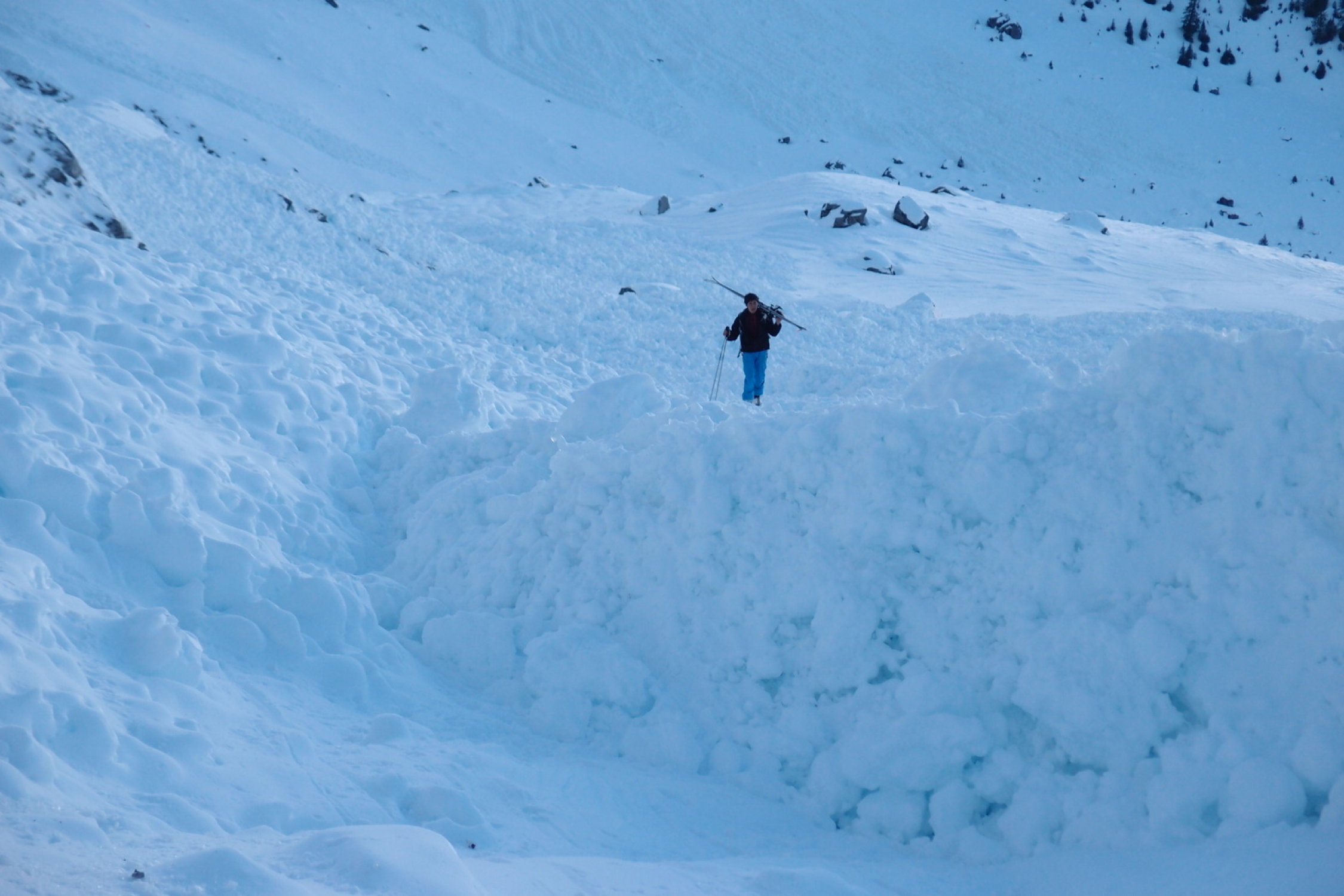 Abfahrt durch die Chälen um 14:30 war sehr gut. Das obere Drittel war perfekt angesulzt. Mitte auch noch ok. Dann muss man irgendwie den Weg durch die Lawinenkegel finden. Unten raus dann schon weicher Schnee, wo man auch etwas tiefer eingebrochen ist.