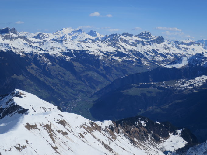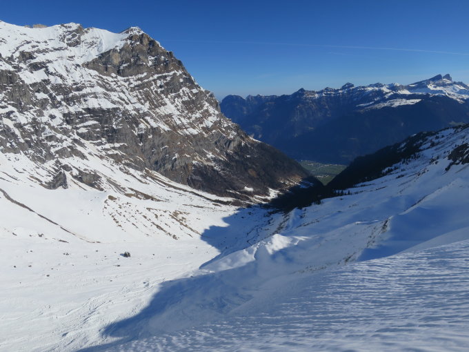 Im Aufstieg auf der ganzen Strecke griffiger leicht aufgesulzter Schnee. Die Berge haben überall ihre Schneelast abgeschüttelt, Lawinen Überschreitungen sind im Gebiet unumgänglich. Am Donnerstag ist noch ein Schneebrett vom Brunnistock her über die Aufstiegsspur abgegangen.