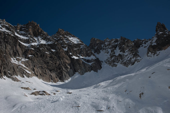 Aufstiegsverhältnisse gut, praktisch kein Lawinenschnee, abgesehen von wenigen Metern am Fusse des Couloirs. Mit Skis bis etwa 50hm unter den Bergschrund. Bergschrund selber kein Thema. Im Couloir exzellente Aufstiegsverhältnisse, Einsinktiefe wenige cm, besser resp. kraftsparender geht es wohl kaum. Kletterstelle ist wirklich harmlos, es sind nur etwa anderthalb Meter zu klettern. Da man im Falle eines Ausrutschers aber das Couloir runterfliegen würde, lohnt sich die Mitnahme eines Seiles dennoch. Der Riss lässt sich mit einem 1er oder 2er Cam gut absichern. Nach etwa 6m hat es ein Stand (in der kleinen Felsbarriere rechts eines Zackens). Danach durchgehend Schnee bis auf den Gipfel. Im Abstieg kann man an einem Stand bis ins Couloir abseilen, die Abseilstelle ist etwa 6m lang. Fussabstieg durchs Couloir etwas mühsam, ein zweiter Pickel würde für den Abstieg durchaus Sinn machen.