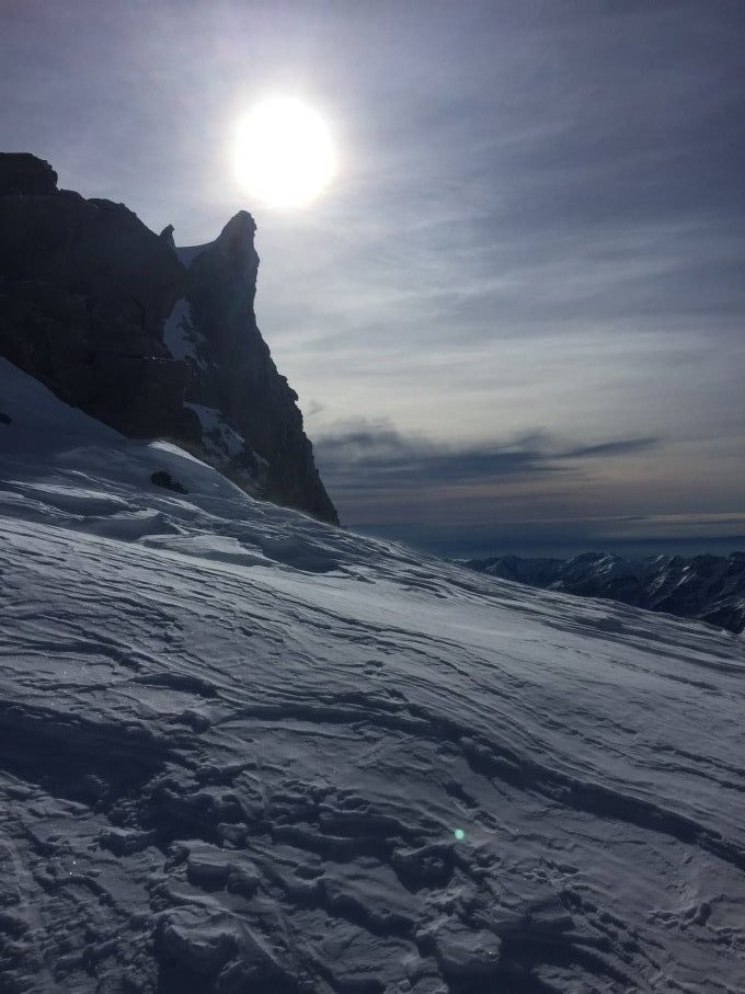 Route ab Pont bis zur Hütte Vittorio Emanuele kompakt und griffig, ab der Hütte Route im Aufstieg pickelhart und sehr stark vom Wind bearbeitet. Mit Harscheisen aber bis auf ca. 3800m gut zu machen. Ab dort im Aufstieg besser zu Fuss bis zum Skidepot einige Meter unter den Gipfel. Der Aufstieg zum "Madonna-Gipfel" ist nicht sehr schwierig, aber zu oberst sehr ausgesetzt. Dieser Teil ist mit Haken ausgerüstet und kann gut abgesichert werden.
