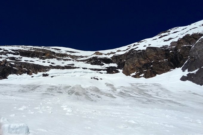 Felsband auf P. 3076 gut mit Ski passierbar, Südwand in mittelmässigem Zustand hauptsächlich mit Nassschnee, aber vor und beim Fixseil hart bzw. eisig. Fixseil hat beschädigten Mantel, hält aber zur Zeit noch.