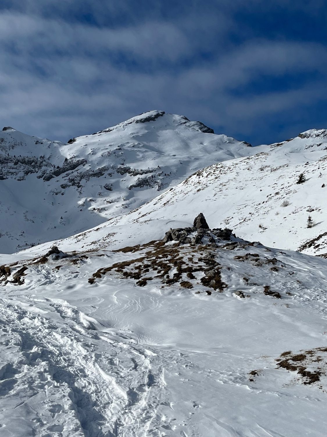 Generell zu wenig Schnee. Unten bei der Hirsegg gestartet. Für den Aufstieg reichte der Schnee. Abfahrt dann eher schwierig, Steinkontakt auf der ganzen Abfahrtsroute kaum vermeidbar. Ausnahme Gipfelhang. Hier gabs ein paar schöne Schwünge im Pulver. Bis ca. 13 Uhr sonnig, dann bewölkt. Praktisch windstill, auch auf dem Gipfel.