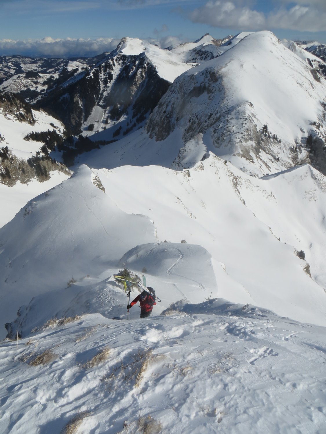 Augezeichnete Schneeverhältnisse im Aufstieg (ohne Steigeisen) dafür südseitig mit Harscheisen, da etwas glasig, dafür Abfahrt im Pulverschnee. Wir haben vom Chüearnisch die Direktabfahrt zum Gantrischli gewählt.