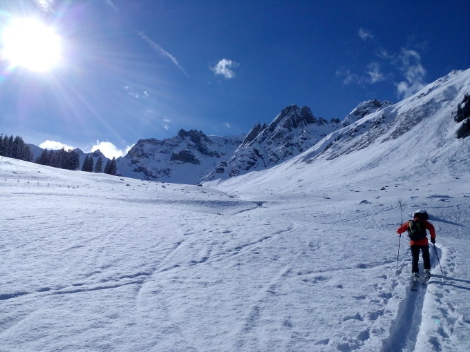 Nachdem das klare Wetter uns überraschte, begeisterte unerwartet viel Neuschnee schon bei der Anfahrt. Ca. 20 cm auf der ganzen Route bis zum Parkplatz. Start kurz nach 9 bei schönster Witterung und einigen Grad plus.