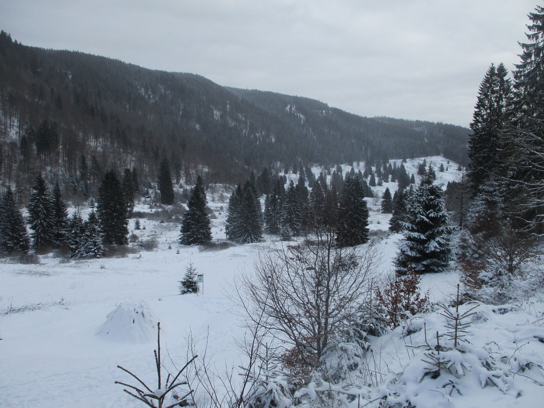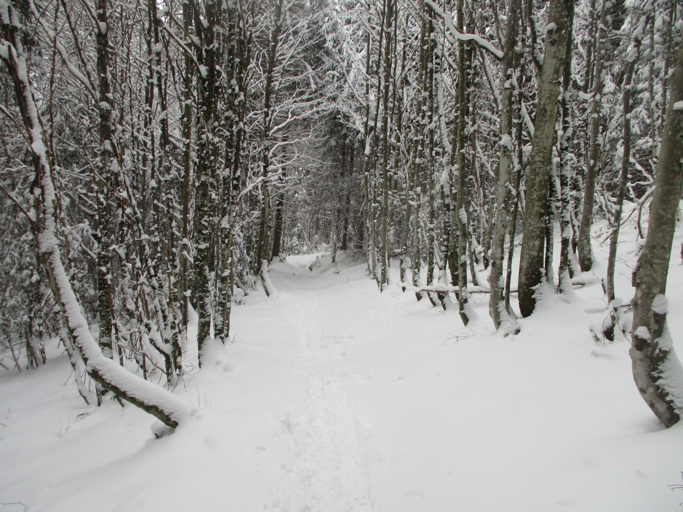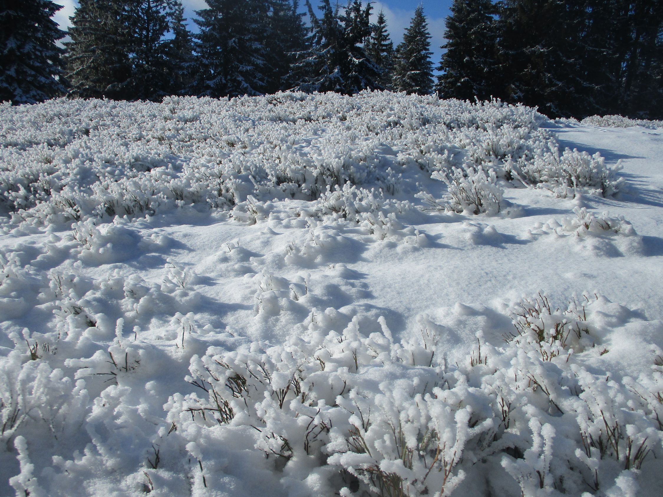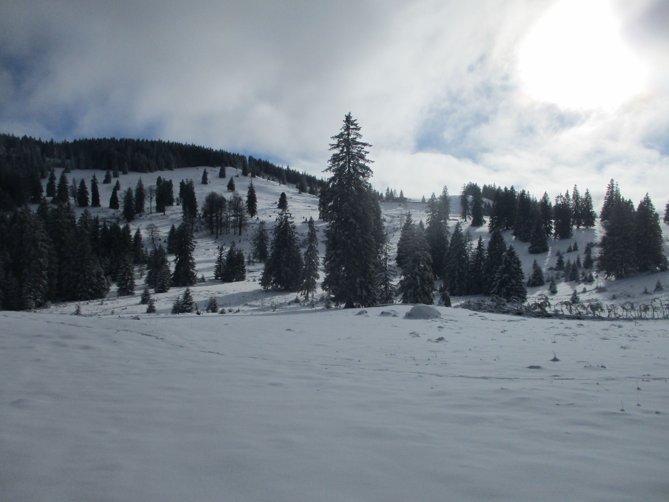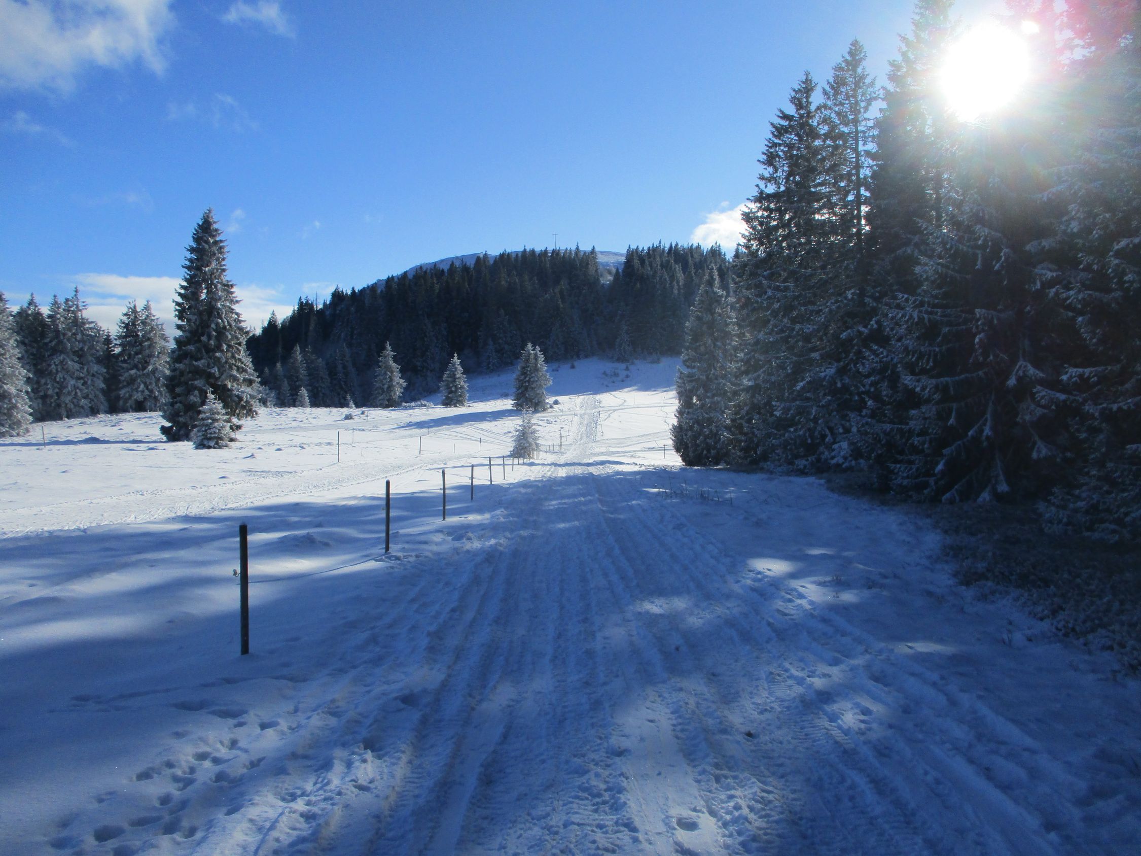 Alles weiß, doch nur wenige Zentimeter Schnee. Zudem waren überall Spuren vorhanden, sodass meine Entscheidung, heute die Schneeschuhe zuhause zu lassen, die richtige war.