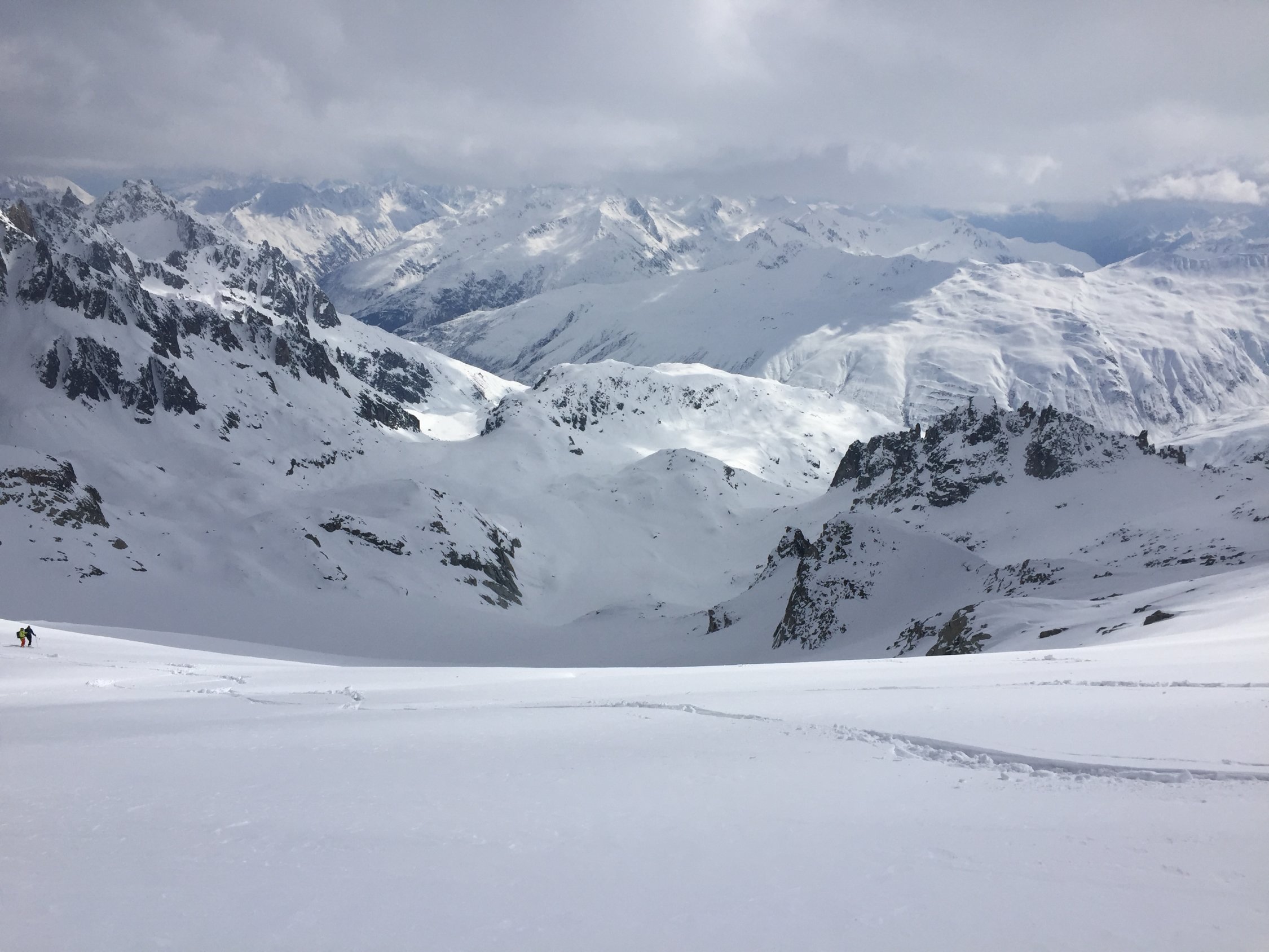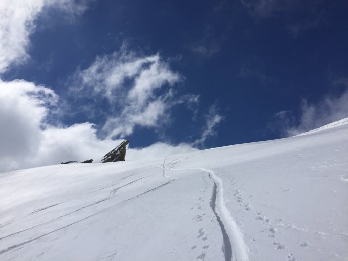 Start um 0630h bei 2 Grad. Wir waren aufgrund des Lawinenbulletins etwas verunsichert in Bezug auf Nassschneelawinen. Die Schneeoberfläche war gefroren. Tiefer liegende Schichten jedoch etwas feucht. Noch nicht besorgniserregend zur frühen Stunde. Dank der nächtlichen Abstrahlung, der herrschenden Temperatur und nach freundlicher Beratung mit einem Türeler, entschieden wir unser Vorhaben in die Tat umzusetzen.