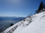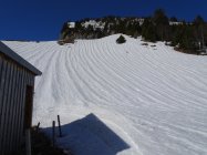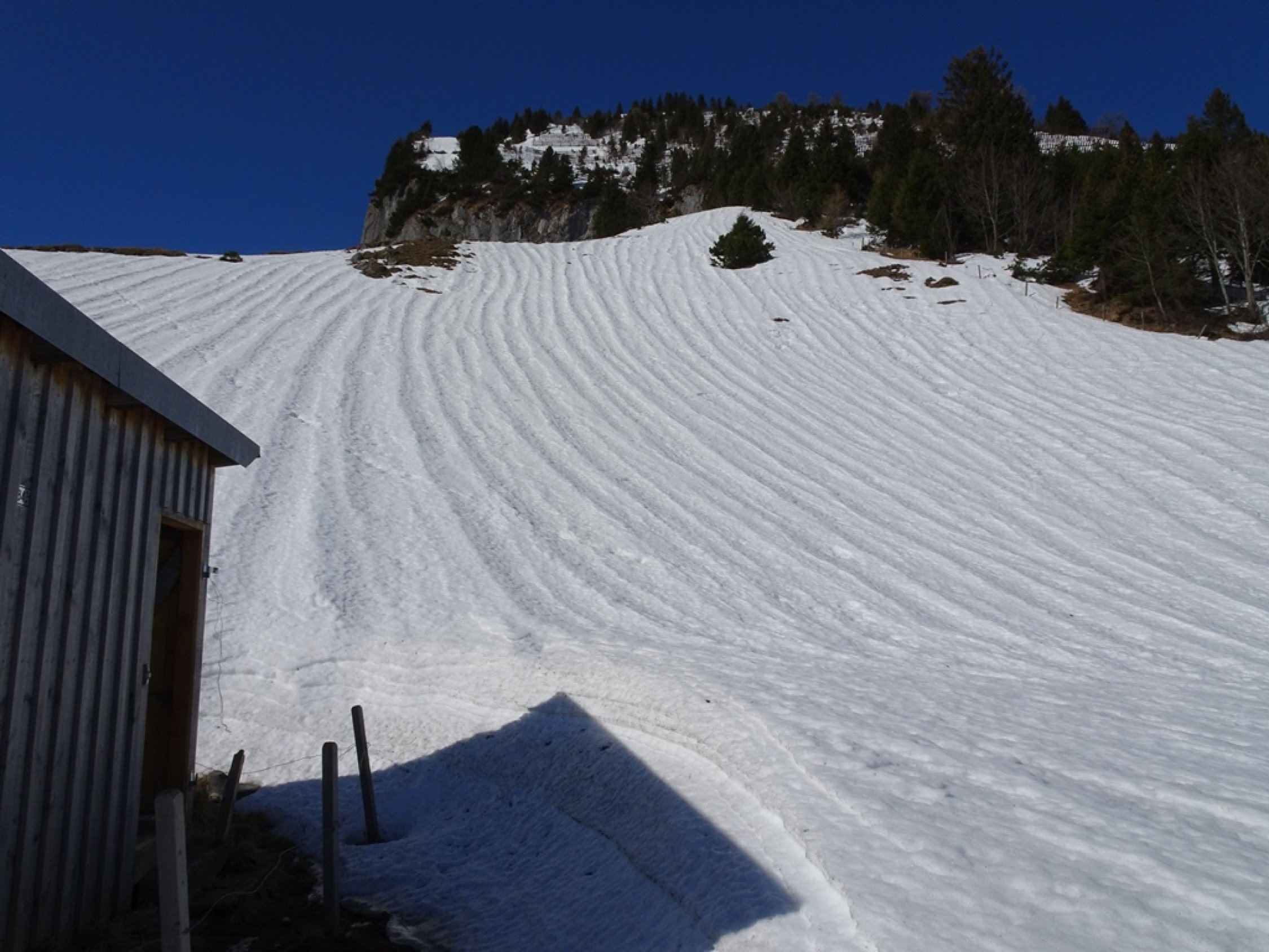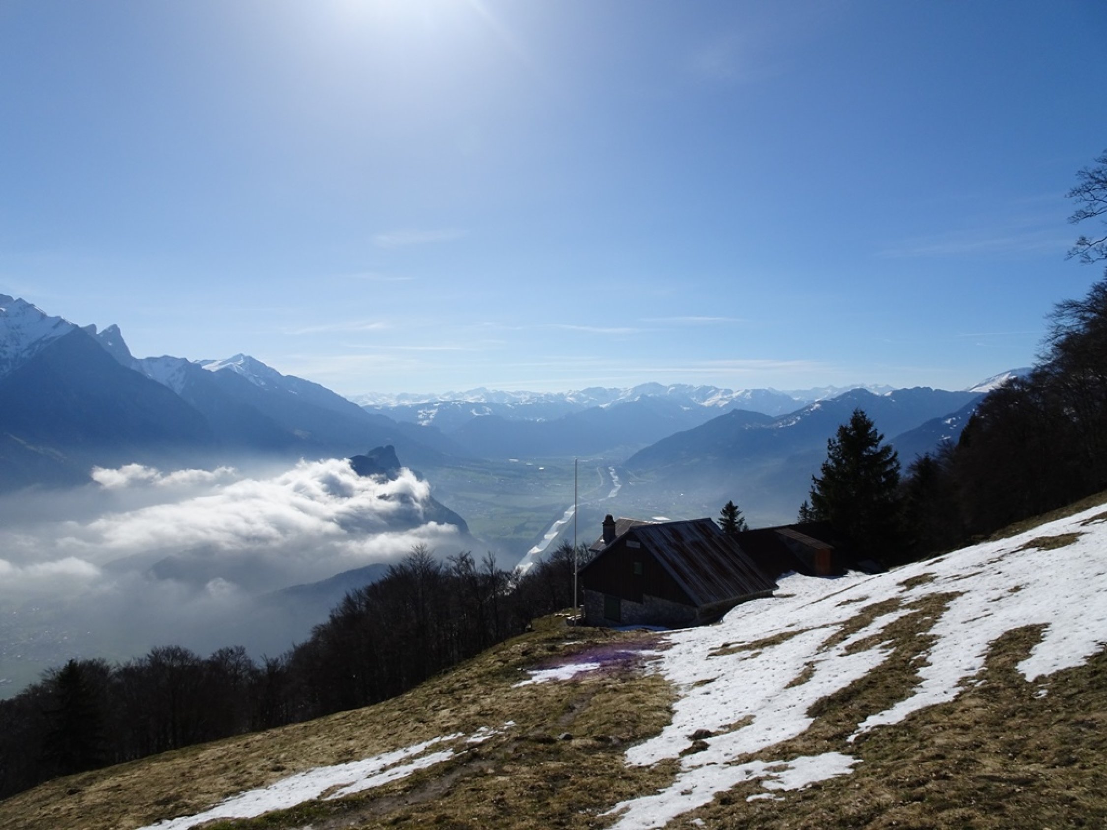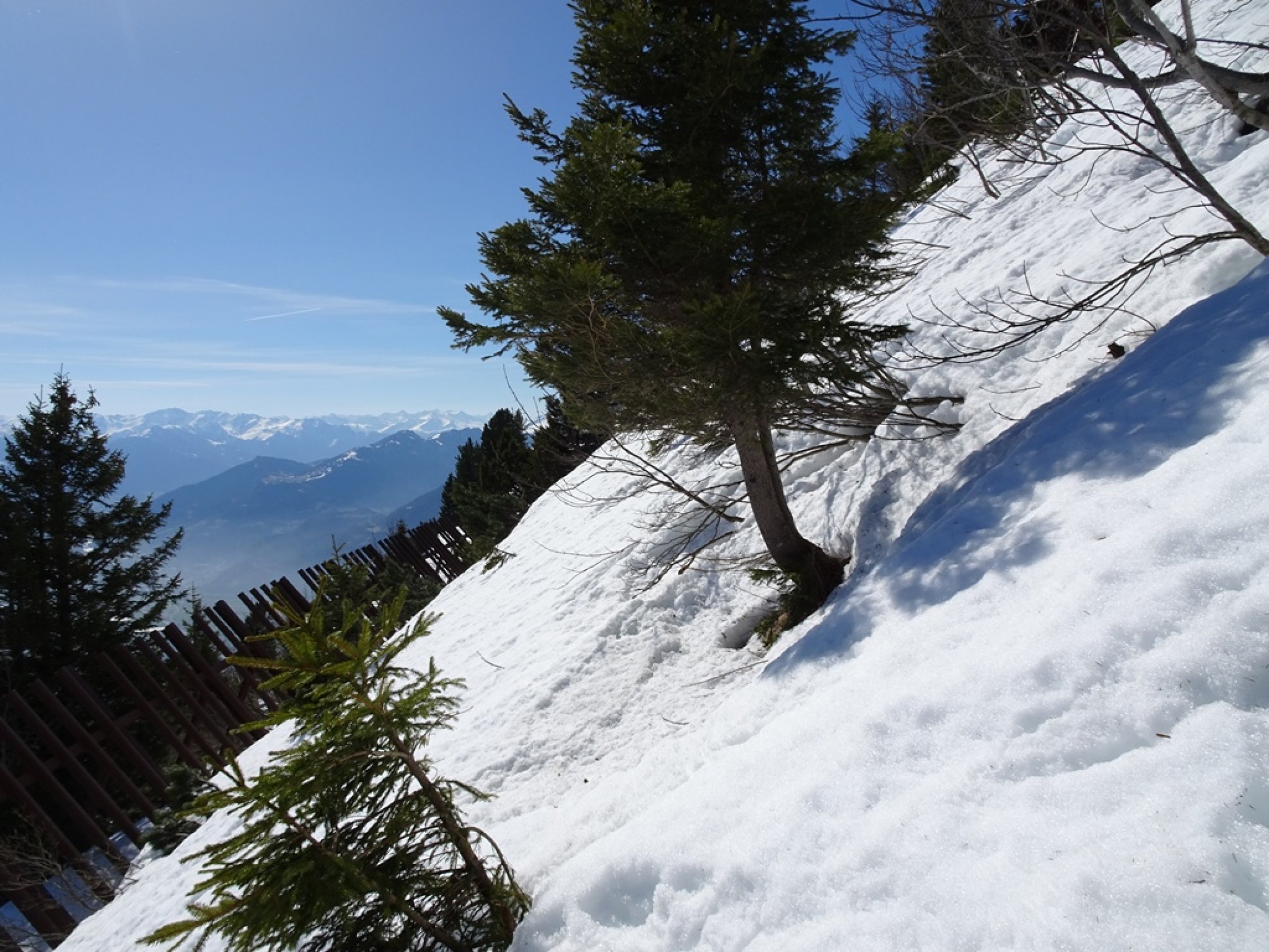 Auch wenn der Gonzen von Sargans aus schneefrei aussieht, liegt in seiner Ostflanke noch einiges an Schnee. Bis zum Älpli auf 1337 Meter ist es schneefrei und trocken. Richtung Lawinenverbauungen liegt ab ca. 1400 Meter Schnee, der bei diesen Temperaturen ziemlich weich war. Zwischen den Verbauungen dann auch knietief oder tiefer eingesunken.